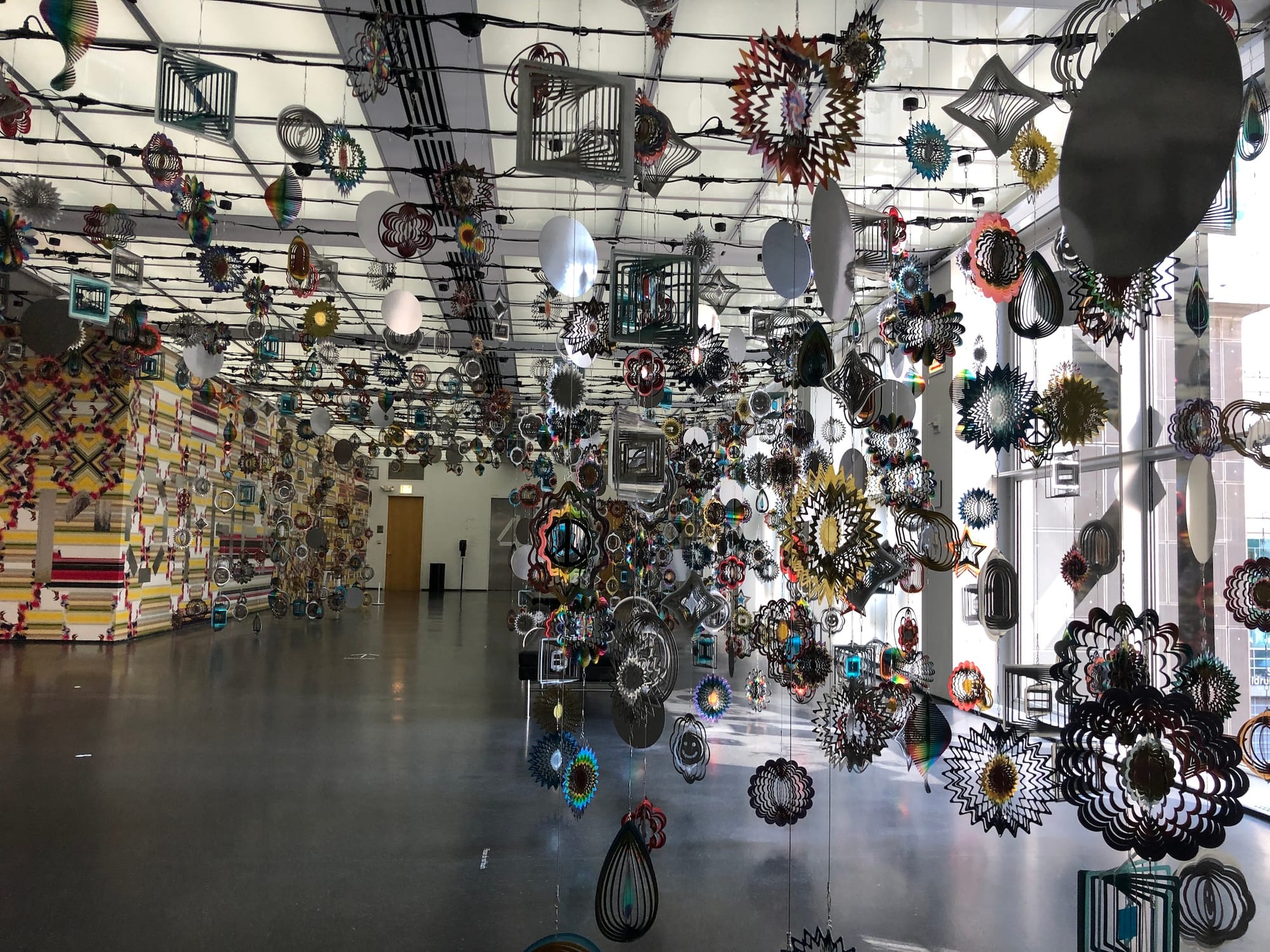 CHICAGO — Before entering Nick Cave’s career-spanning exhibition, Forothermore, curated by Naomi Beckwith, visitors must approach through a kinetic forest of twirling, twinkling wind-spinners hanging throughout the foyer and upper atrium of the Museum of Contemporary Art’s fourth floor. In the first room, a dazzling beaded-mesh wall stands adjacent to a giant wire tondo; in between are a series of riotous Soundsuits on a plinth. With barely a foot in the door, Cave’s aesthetic world is already overwhelming.
