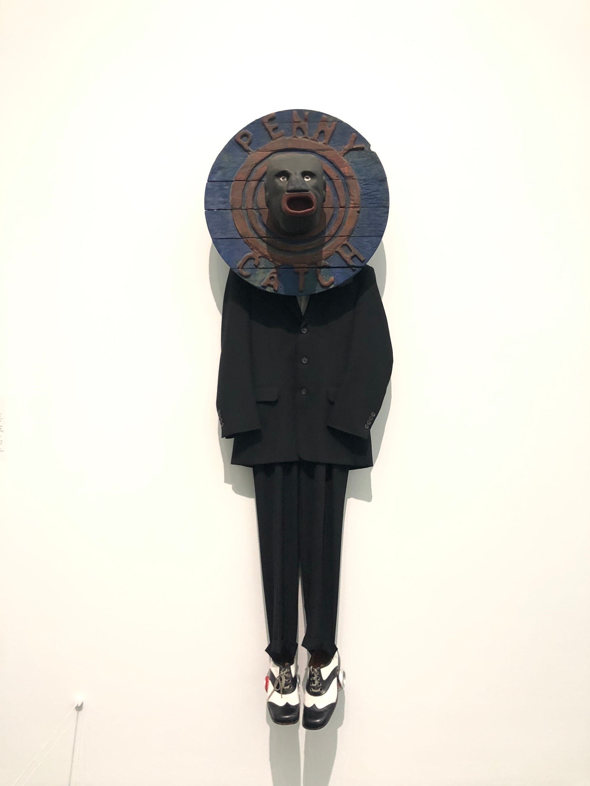 Yet the exhibition’s second room is quiet. Here, “Penny Catcher” (2009) dangles from the wall like a poignant call to remember the depth of American racial violence. Cave has clothed an antique carved wooden head of a Black man with his mouth open (a flea market relic from a carnival toss game) in a formal black suit with white spats that rest on crushed Pepsi cans. This effigy speaks of morbidity, pain, and all the country fairs where White folks did not question the enmity of degradation.