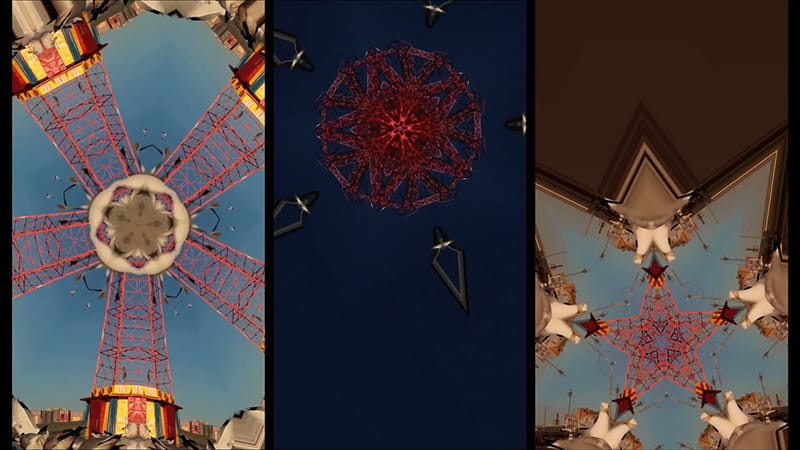 Thornton, based between New York and Rhode Island, has chosen Coney Island as her setting. It’s a perfect choice given its carnivalesque history: a place of play, entertainment, amusement and marginal subcultures. Her camera is focused on its greatest icon: the Parachute Jump. Included in the National Registry of Historic Places, the 250-foot-tall amusement ride was originally installed for the 1939 World’s Fair in New York and moved to its current location in 1941. It ceased operations coincidentally at around the time of the second New York World’s Fair in 1964. This fantasy icon lends itself graciously to digital manipulations of time.