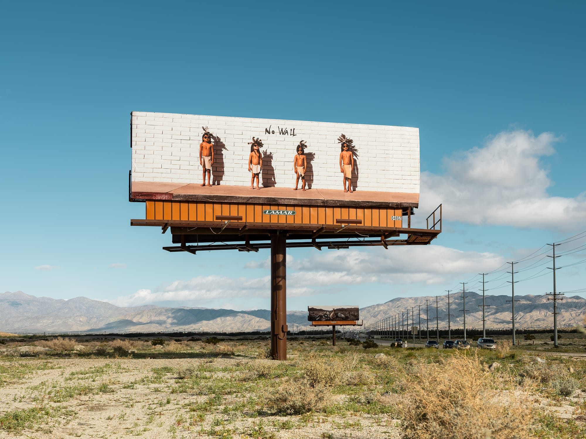 Nearby, Cara Romero, a Chemehuevi artist, mounted four billboard photographs on the highway, opposite a series of roadside advertisings. The billboards portray the images of four boys from the Chemehuevi Indian Reservation and are a memorial to the Cahuilla, Chemehuevi, Serrano, and Mojave — the original and still remaining inhabitants of the Coachella nation.