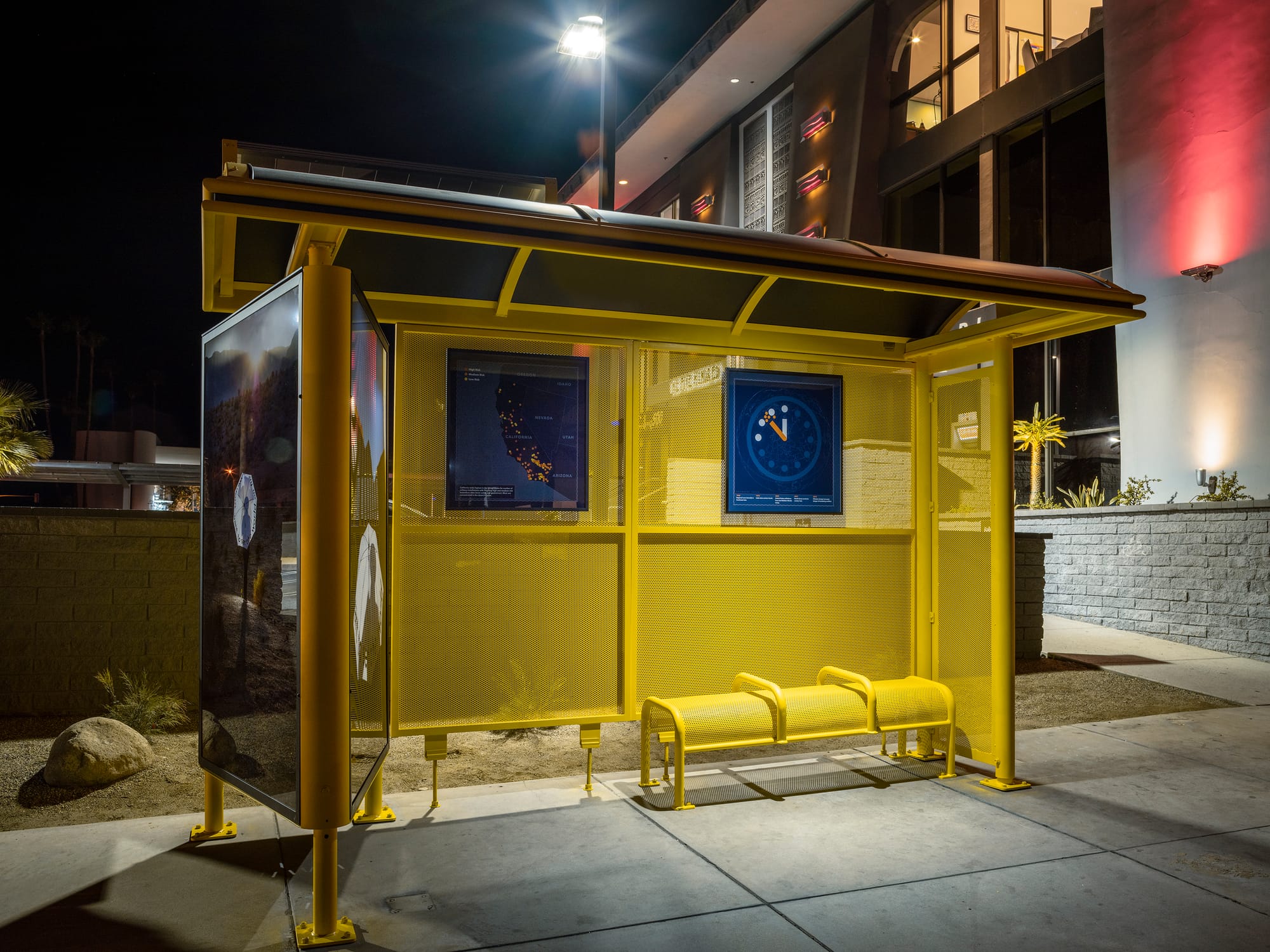 Mary Kelly’s “Peace is the Only Shelter” collects three yellow bus shelters reminiscent of nuclear shields in an area where extensive nuclear testing was conducted by the American military. The artist, a longtime student and proponent of the Cold War-era feminist activism of the Women Strike for Peace (WSP), filled the structures with texts from WSP and maps of nuclear test sites in the desert area.