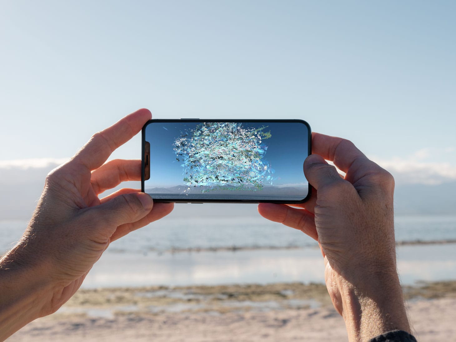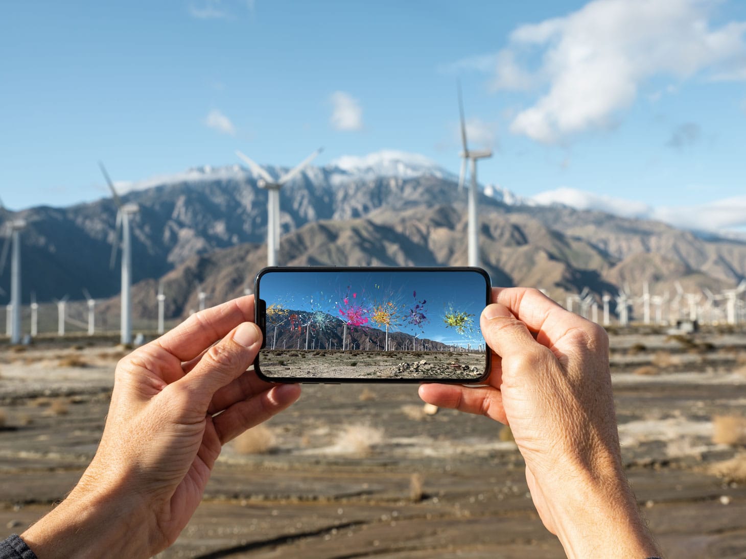 In a gesture to vanish all physical trace in the environment, Nancy Baker Cahill created an augmented reality app that reacted to the windmill farms in the north (“Revolutions”) and Salton Sea in the south (“Margin of Error”) with confetti-like explosions on phone screens aimed at the sites. It points out the toxic outcomes of unhinged developments in the area, and the hidden costs of the resort’s development.