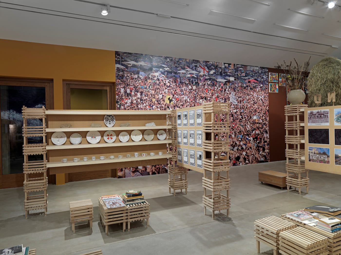 Things become much more orderly in the show’s back half. The penultimate gallery, labeled “Revival, Resurrection, and Transformation,” is a museum-quality addition. Set in a spacious dark-blue room, Sutherland has assembled a meditation on modern consumption and agricultural techniques that alienate us from food sources. A row of tables in the gallery’s center stage a Last Supper scene with phallic vases, Laure Provost’s carnal ceramics, and, oddly, bags of red liquid labeled “Intemperate Youth.”