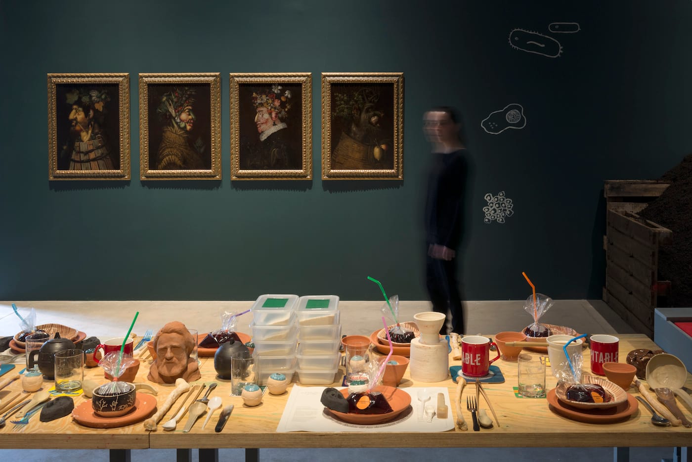 Things become much more orderly in the show’s back half. The penultimate gallery, labeled “Revival, Resurrection, and Transformation,” is a museum-quality addition. Set in a spacious dark-blue room, Sutherland has assembled a meditation on modern consumption and agricultural techniques that alienate us from food sources. A row of tables in the gallery’s center stage a Last Supper scene with phallic vases, Laure Provost’s carnal ceramics, and, oddly, bags of red liquid labeled “Intemperate Youth.”