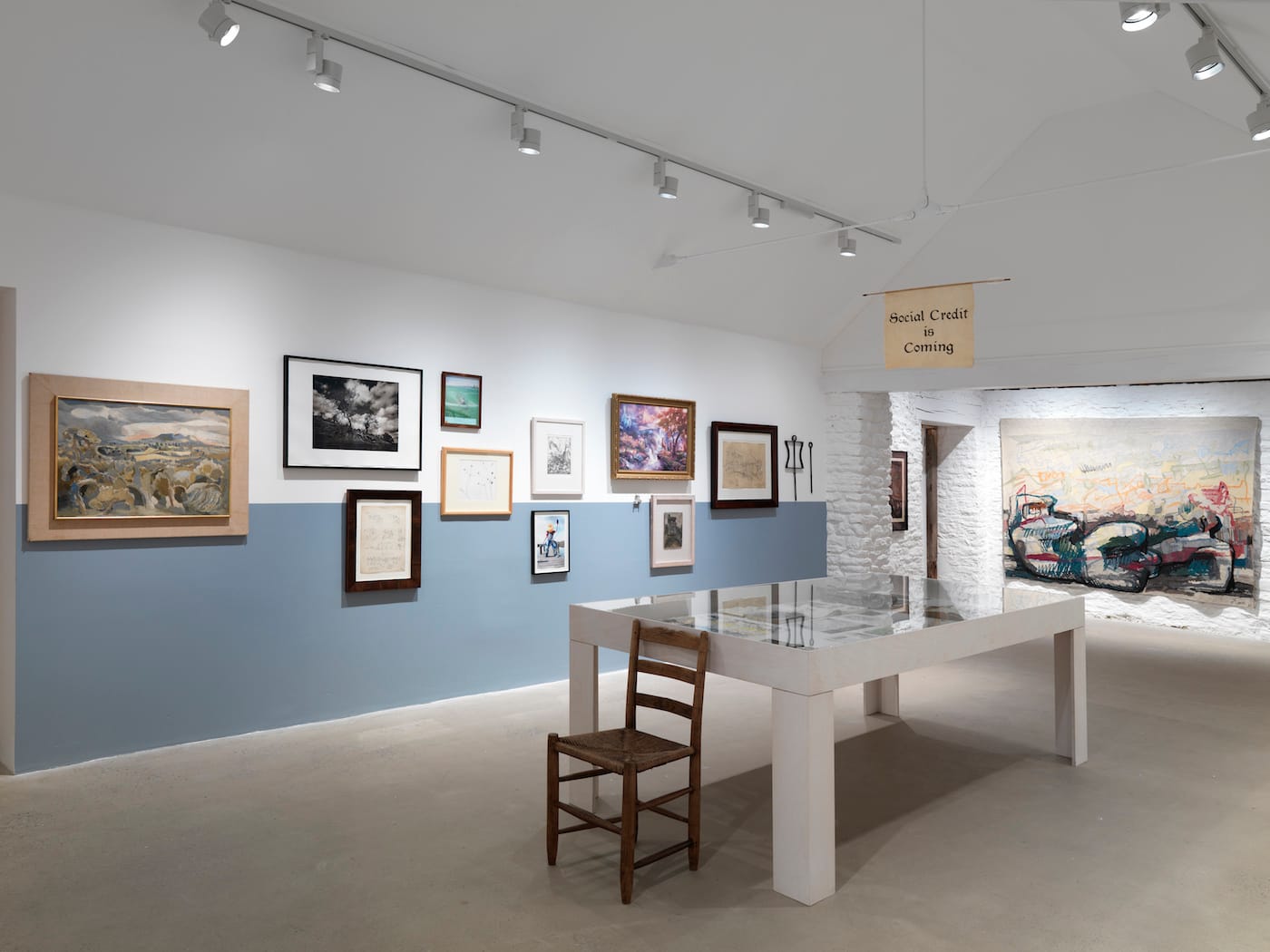 Elsewhere in the exhibition, clear messages are hard to find. Themes are declared but rarely justified. The third room is organized under the banner of socialism, but it is hard to discern how any of the work explicitly tackles the topic. A central banner reads “Social Credit is Coming,” but that’s about it. Maybe it doesn’t matter much when that same room contains the kitschy spectacles of Thomas Kinkade alongside Beatrix Potter drawings and Henry Moore’s monumental “Reclining Figure: Bunched” (1973/74) tapestry — complete with a preliminary drawing by Moore himself.