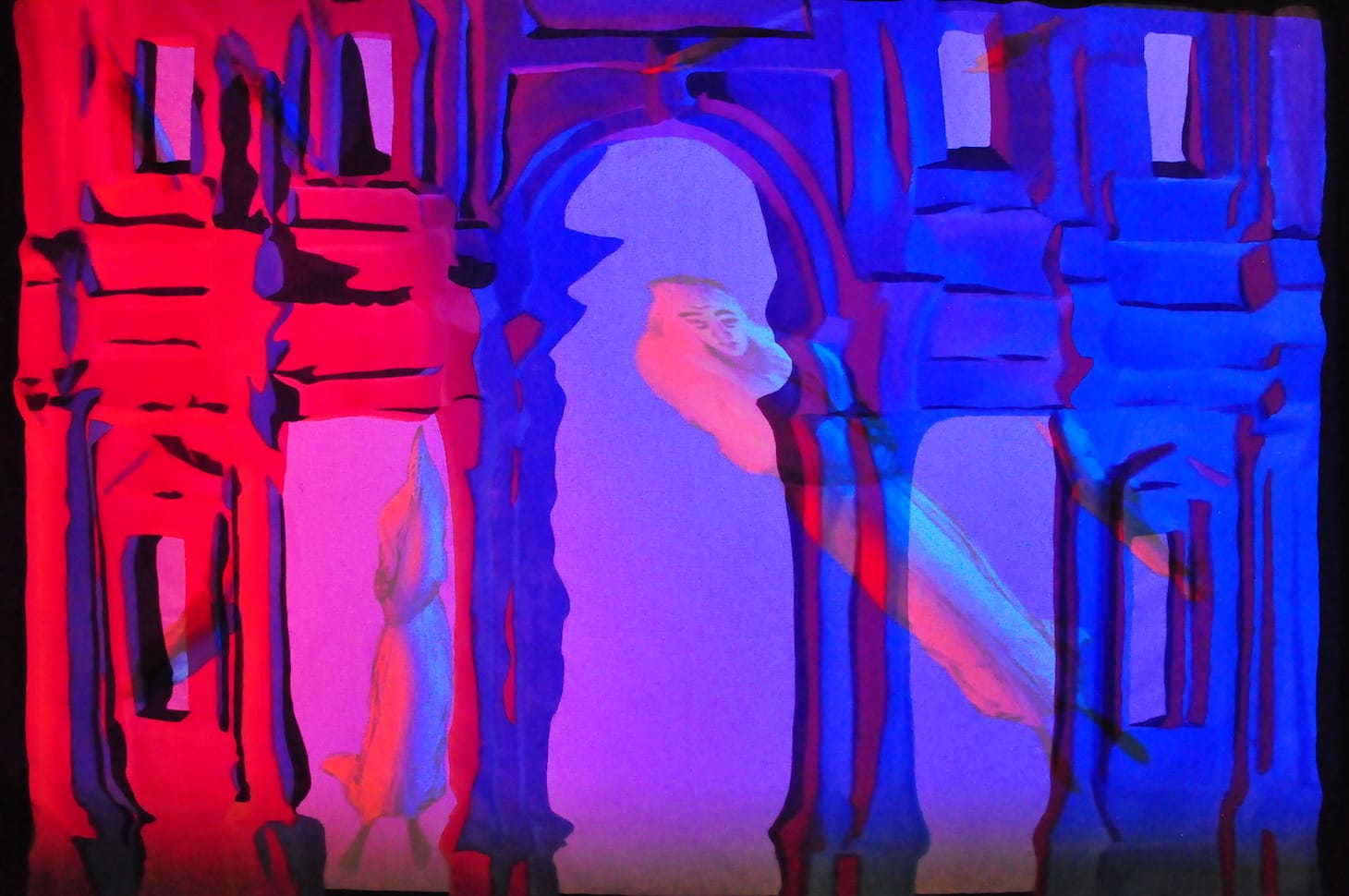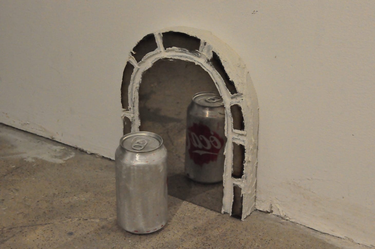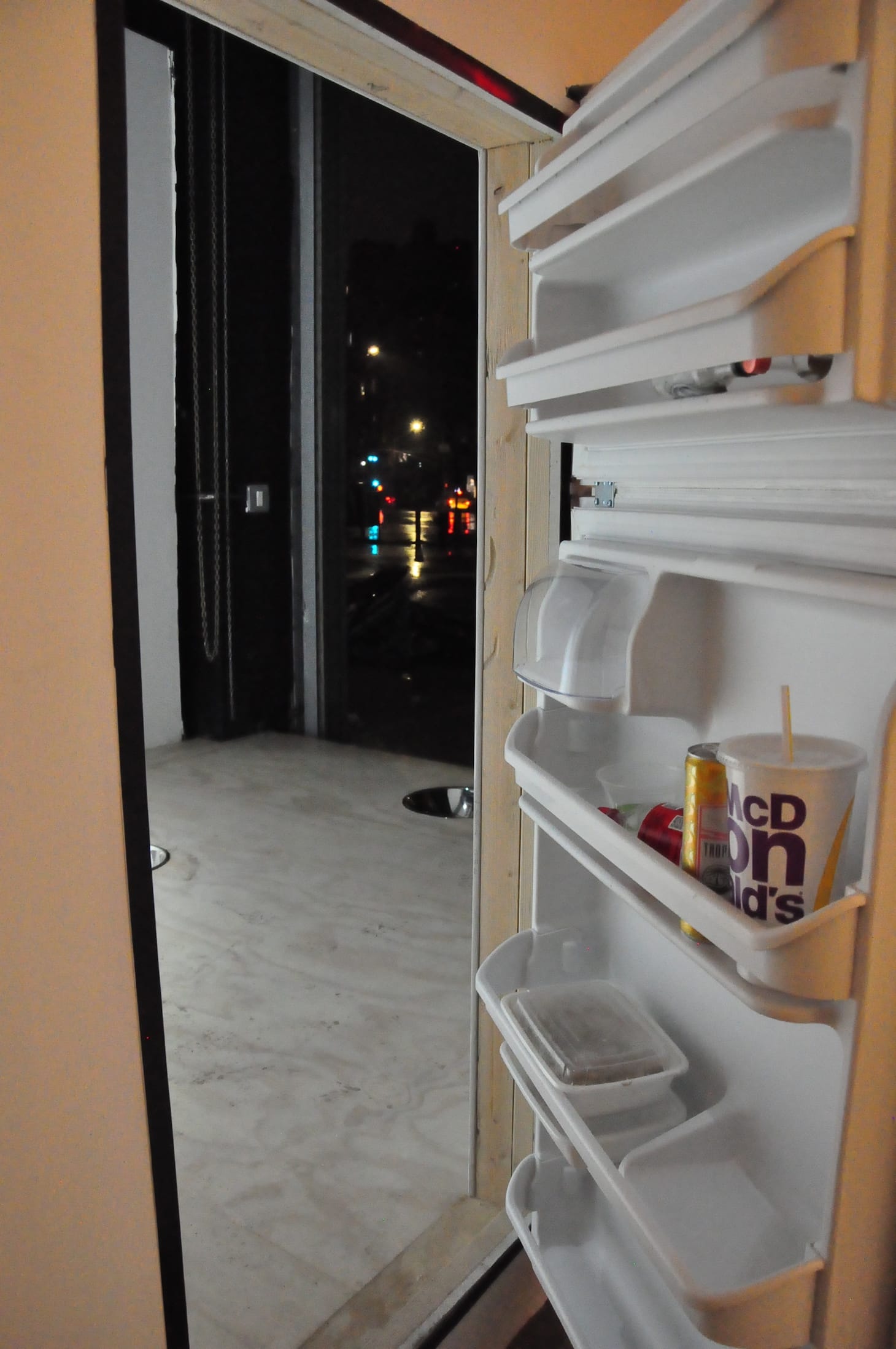 Using a guide and a free zine from the entrance, you can navigate through the two-story gallery and the ideas the graduate students have spent years wrestling with. Most notably, near the entrance is the work “Not Much Δ” by Patrick Carlin Mohundro. Using noisy canister vacuums, acrylic on red Delta blankets you would find on a flight and cough syrup mixed with ballistic gelatin, the work explores the notion of the toxicity of caregiving. Across the hall to the right in what looks like a sparse apartment — complete with a pile of mail and jackets on hooks — is an unassuming refrigerator door full of photos and magnets. Open it, and you’ll have a Narnia-like experience of moving into a cavernous space that leads to the street and the chilly air, which gives Emily Janowick’s work its name, “Fear not the Harsh Winter.”
