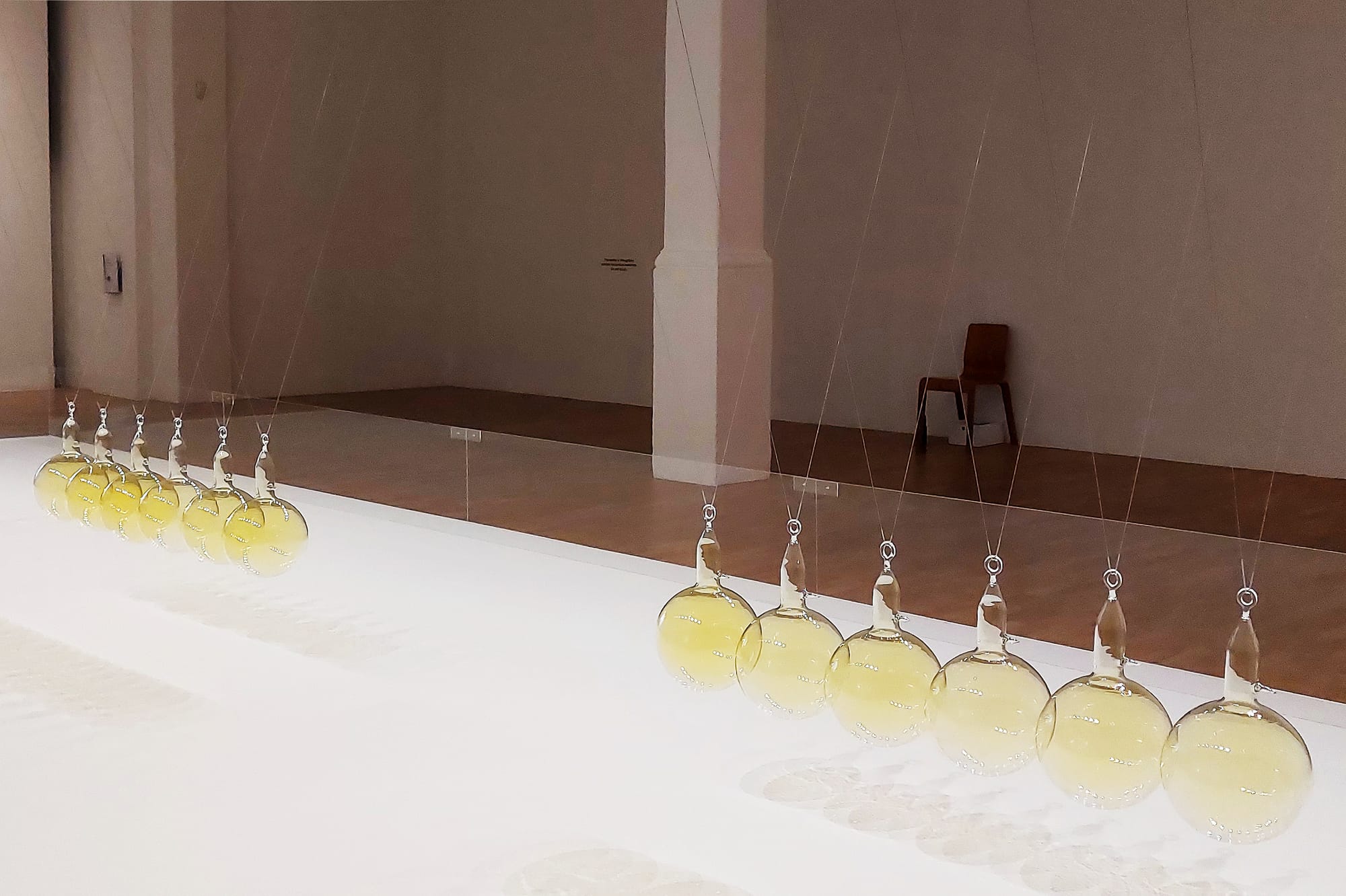 LONDON — There is something both frightening and fascinating about a sculpture that could kill you. Hamad Butt’s Familiars (1992) is a series of three sculptures that, if broken, could toxify the air and cause significant harm. “Familiars 3: Cradle” resembles a huge Newton’s cradle, common as a desk toy, wherein a ball is dropped against a stationary line of similar balls, causing the one at the other end to swing away before it falls back to repeat the process. In this case, however, the spheres are made of vacuum-sealed glass containing greenish-yellow chlorine gas — playing with this toy would spell disaster.