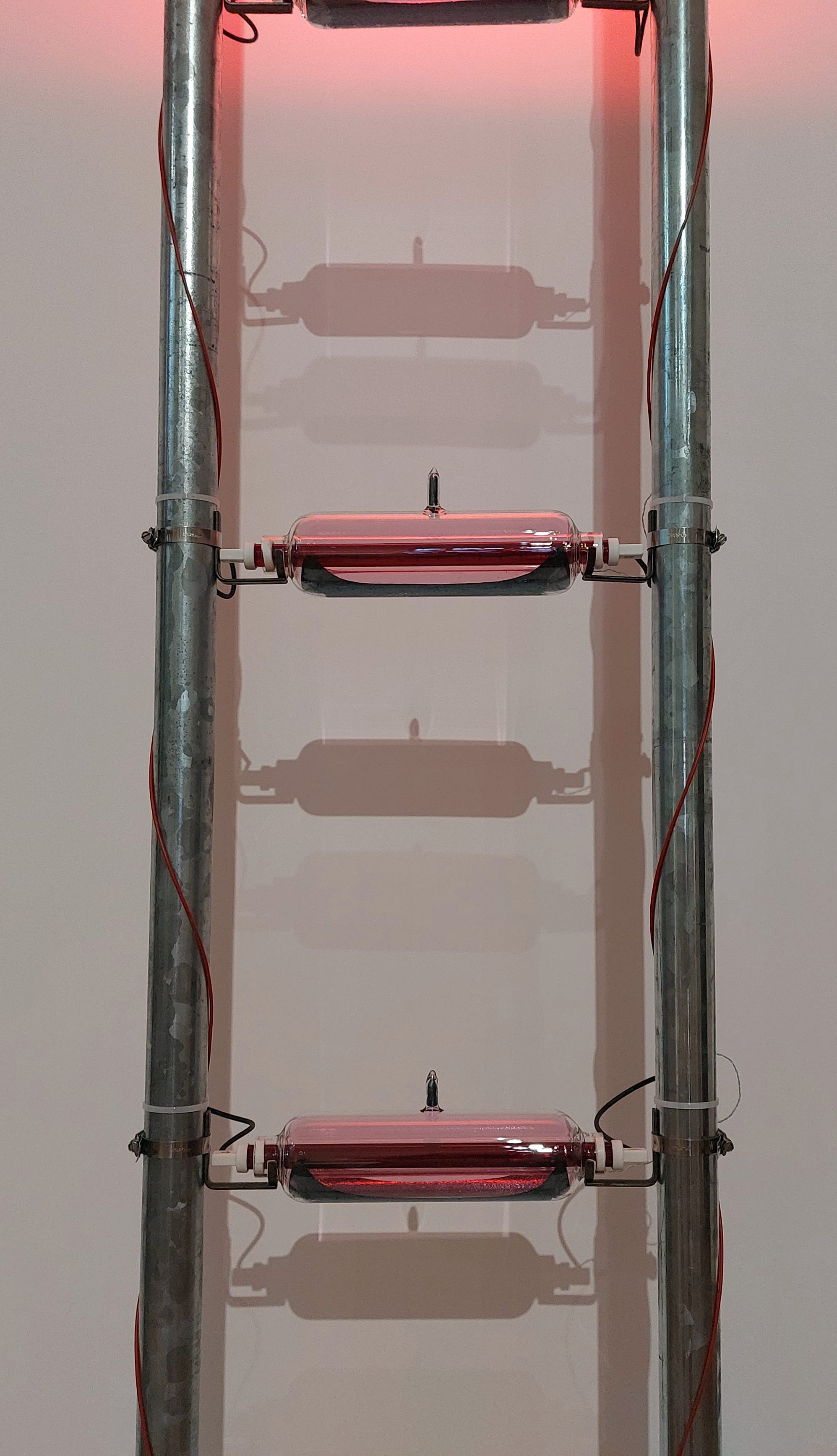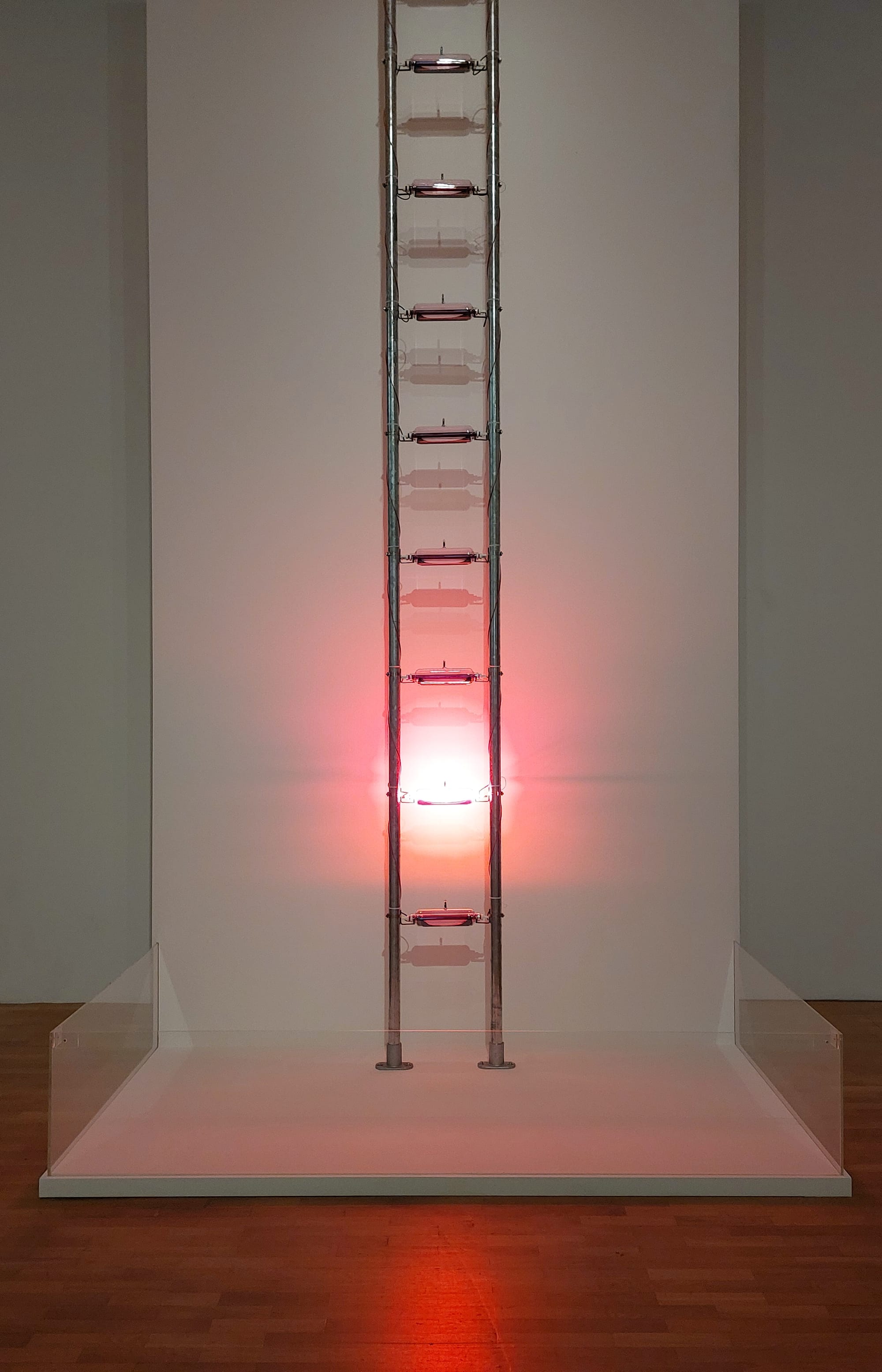 This series exemplifies Butt’s career-long exploration of risk and contagion. Made at the height of the AIDS epidemic, and shortly after the artist’s own diagnosis, which would lead to his premature death two years later, Familiars throws oblique light on the threat of disease and the complex, often contradictory emotions thrown up by the risk of contagion. Another piece in the series, “Familiars 1: Substance Sublimation Unit,” consists of a ladder whose rungs are glass tubes containing a heating element and iodine crystals. The heaters periodically turn on and off, sublimating the iodine into an eerie purple gas, again both fear-inducing and alluring.