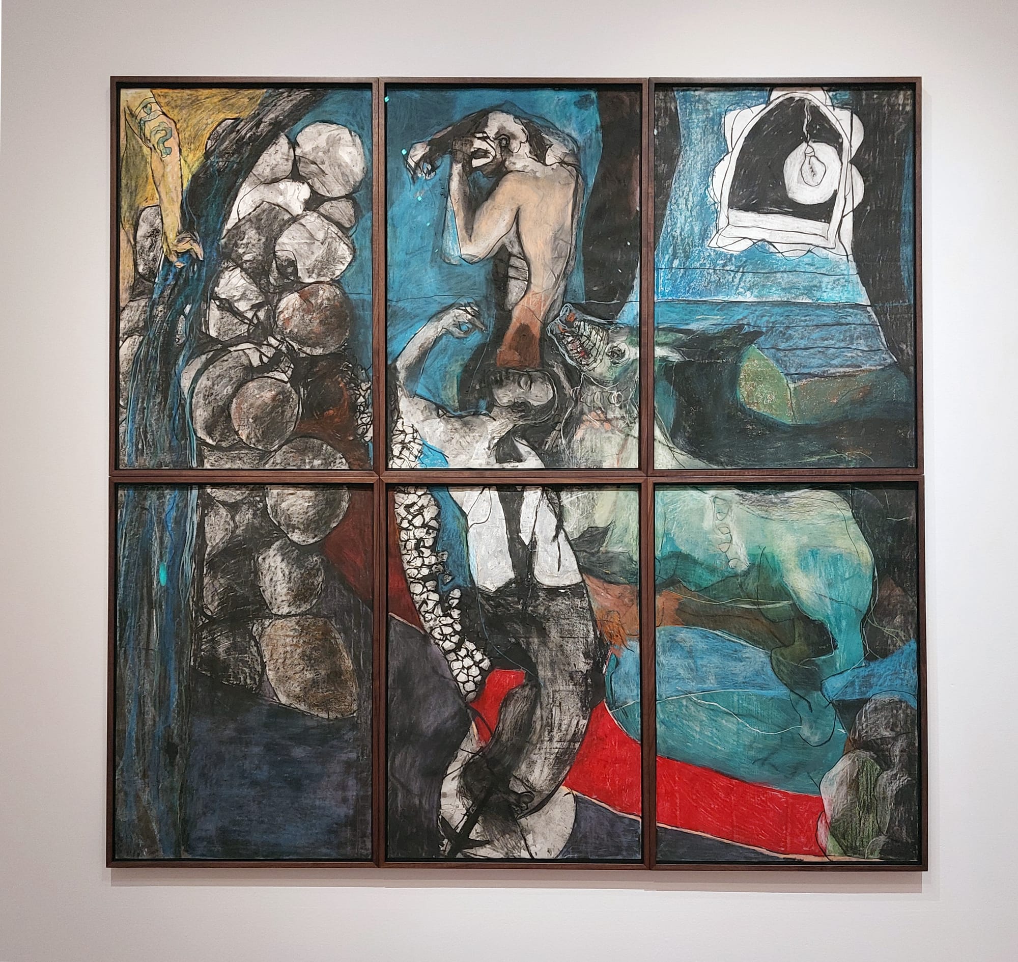 These are confident, conceptually complex, and allusive works, coolly holding their own in the large space of the opening gallery. Their minimalist and scientific aesthetic also offers an intriguing foil to some of the artist’s earlier paintings and drawings, displayed upstairs. A wall text notes that Butt saw his sculptures and paintings as closely connected, particularly in terms of color, but while his sculptures are more formal, his works on paper and canvas are significantly more figurative. “No Title: Figures with Muzzles” (c. 1984) shows nude men being chased into a body of water by dogs in barbed-wire muzzles. The scene, apparently lit by a bare lightbulb, feels both bleak and emotional, perhaps drawing from Butt’s experience of being a queer Pakistani in Britain in the 1980s.