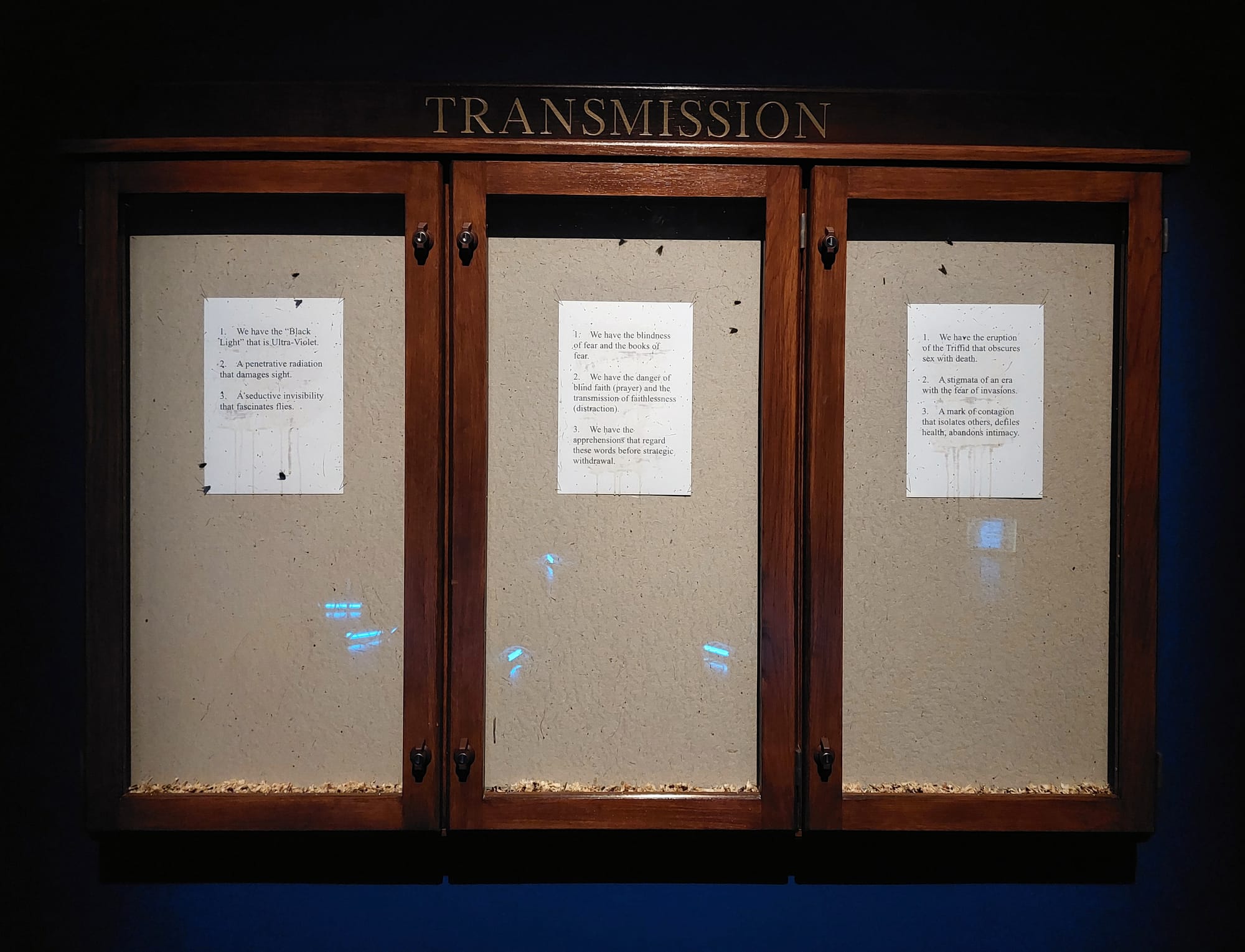 These drawings are directly connected to the installation “Transmissions” (1990), which consists of nine glass books engraved with a triffid and illuminated by ultraviolet light, which can cause damage to human eyes. Visitors are encouraged to put on protective glasses to view the installation, which draws attention to the scapegoating of sexual and racial minorities during the AIDs crisis and beyond. Here, as elsewhere, Butt’s work cleverly and powerfully plays with our sense of fear, examining its source, whether instinctual or instilled in us by political, religious, or media manipulation. In his hands, contagion becomes both poetic device and devastating lived reality — and we are invited to share the complicated emotions it evokes.