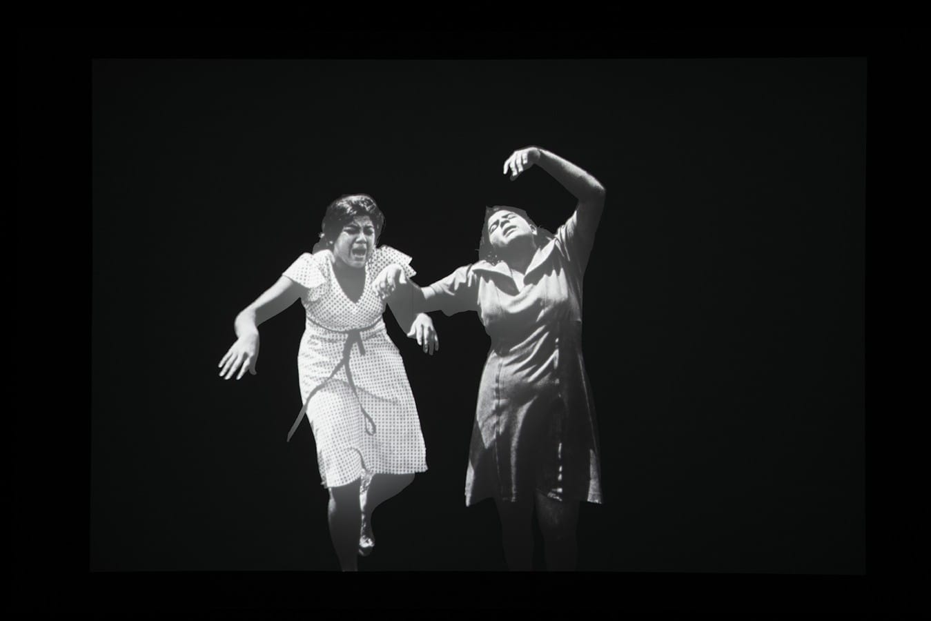 Following the video, in which Wessing also shares how, led by locals, he came to take several photos the same day he took the “Estelí” picture, is a darkened hallway of light boxes displaying these other images. Situated in this way — windows of light in a dark room — the photos evoke the blinkered record from which “Estelí” memorably but only partially could report. Without text or video to guide us, meaning is now left only to the imagery. Which leads directly to the show’s centerpiece: a dark room where an enlarged, illuminated image of the daughters is projected against a wall. Gradually the background fades away, and the women emerge into brightness. Overpowered by the light, the photo is dramatically active, the audience actively passive before this shinning image of pain.