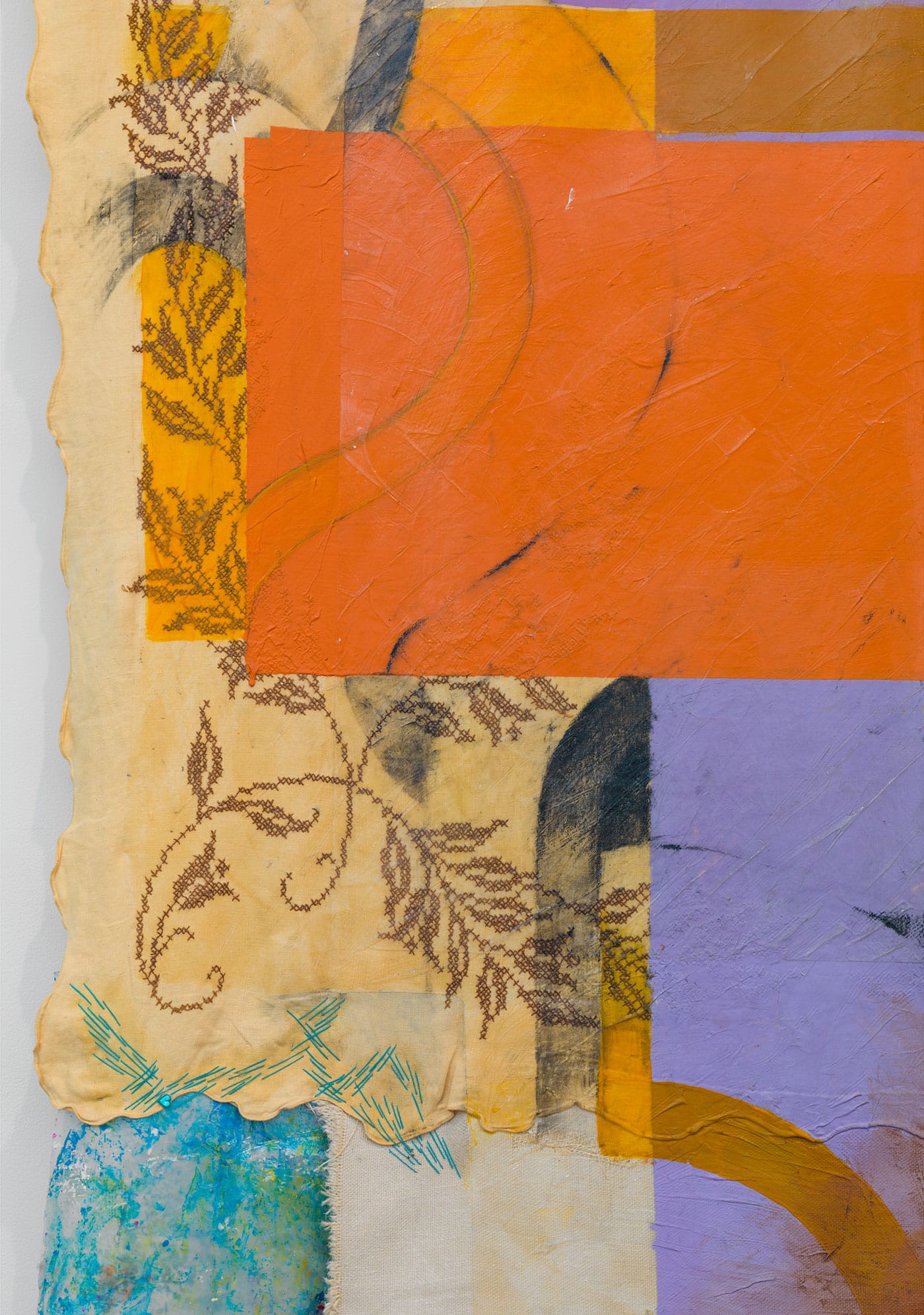 TJ: Marshall and the LDF were the first legal team to use photography as a key element of their strategy. I use photography and printmaking to weave documentation of Brown-related cases with contemporary imagery of human rights abuse and advocacy. I turn photographs into halftone line images for printing. This allows me to use printmaking to draw into my paintings with cross-hatched lines. The photographic image serves to introduce graphic color into the painting ground. It formally comes back to the discipline of drawing. I love when things emerge over time, like moments that differentiate the treated and raw gauze or when a cluster of cross-hatched lines, embroidered or printed, reveals a courtroom scene.