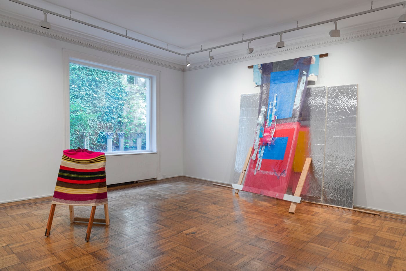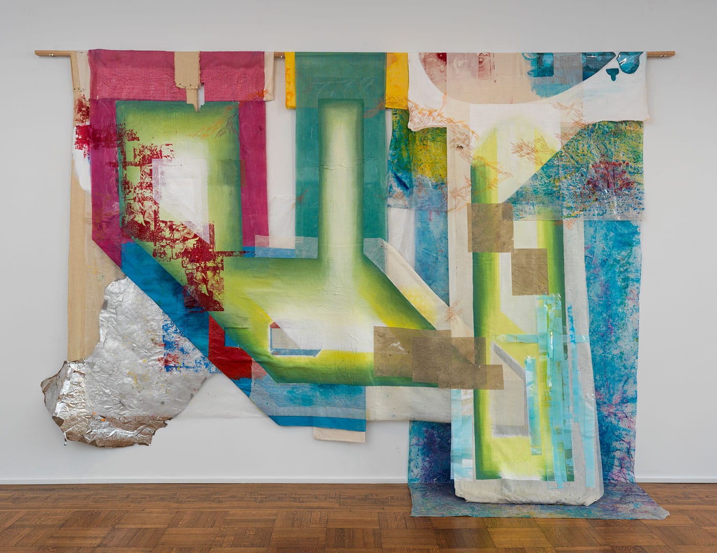 TJ: In 2006, my first interest in the material had to do with flesh — my own flesh and damaged flesh. Color is a light issue. I looked to stained glass in cathedrals for sublime inspiration. The pieces are often attached to materials I’ve pulled from the insides of buildings like pipes and floorboards, activated by natural and artificial light. In recent years I’ve added food wrappers from the children I took care of as a nanny from 2012 to 2014. I’m interested in the materiality of resources and how value is created.