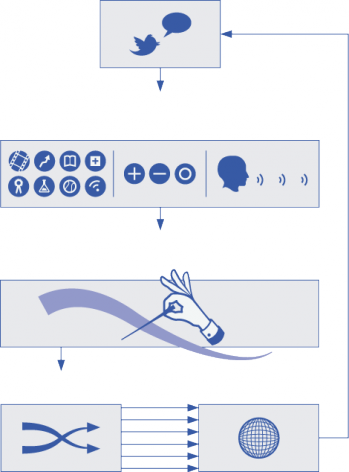The Listening Machine, created by Daniel Jones and Peter Gregson for the BBC’s digital arts channel, is trying a different tack. With a simple triangle for sentiment and turning gears for topics and rate of t.weets, the site lets you see at a glance what people are talking about online.