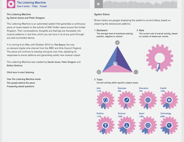 There are lots of sentiment analyzers out there, but The Listening Machine’s simple infographics make it charming and somehow more manageable. It’s also just a small sample of people — 500 Twitter users were selected to represent the entirety of the UK Twittersphere. And there’s sound, too: