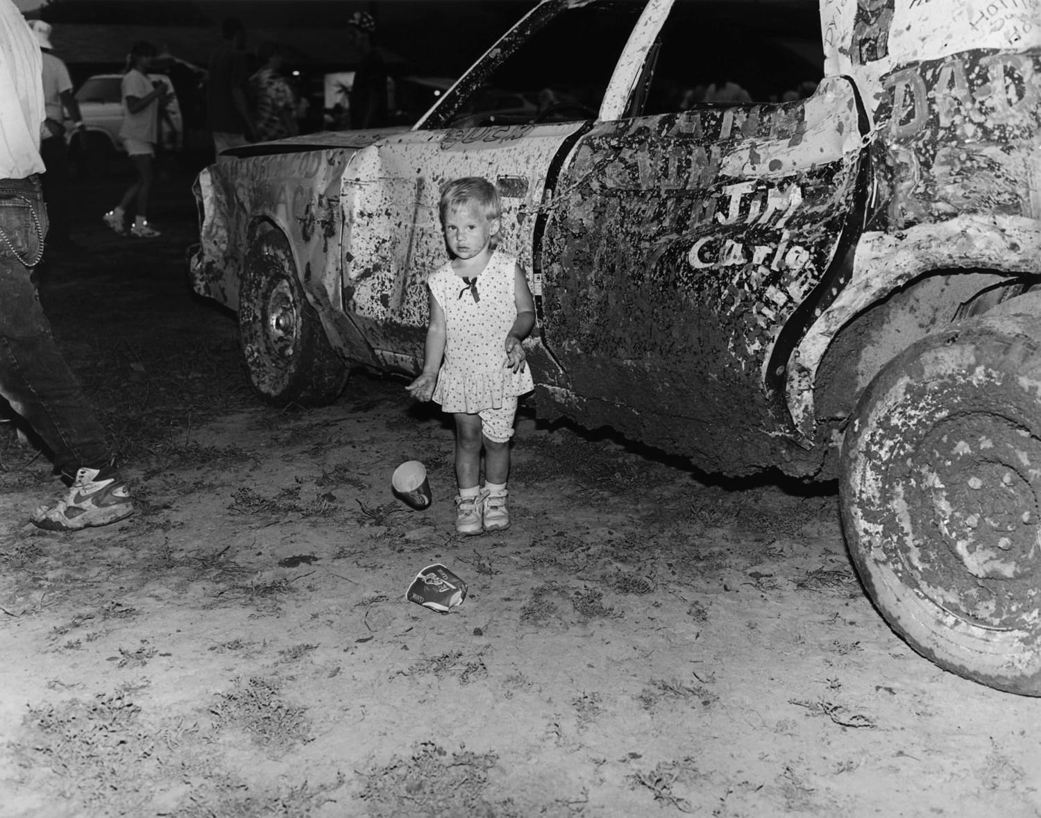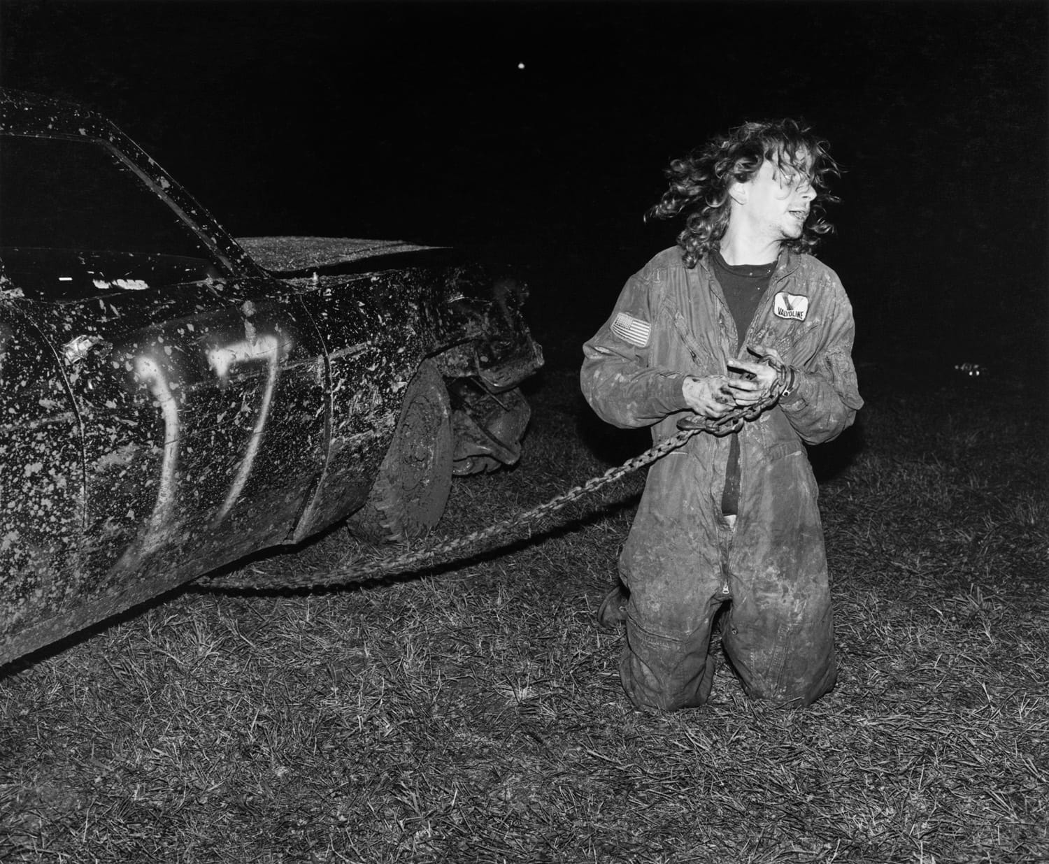 Derby’s tightly cropped, sharply focused pictures capture participants up close as they socialize around, rest in, and steadfastly fix up the cars that they send into battle. Women are largely absent from these pictures, though they did attend the events: one photo catches a little girl in a polka dotted dress with a bright flash, her paper cup falling to the ground as she stands beside a mud-splattered, dented derby car. In another, a man and woman embrace, both clinging to the same tire on a fence post. But most of these photos — as with Graves and Lipman's previous projects on boxing, wrestling, the rodeo, and the military — are arenas for exploring the male body within a homosocial ritual.