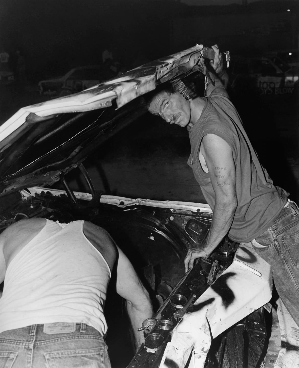 Despite their unusual subject matter, Graves and Lipman didn’t consider this an ethnographic or documentary project. “Ken and I never photographed thinking about documenting,” Lipman said on a recent phone call with Hyperallergic. “We were not interested in making pictures that would be literal. We would go into a subject looking for images that had a bigger, more transcendent meaning.” Together, Graves and Lipman’s elegant images suggest that the derby is tied up in emotions that might seem unexpected for such a harsh and violent sport: among the dust and banged-up cars, their pictures emanate a sense of commitment, pride, and even love.