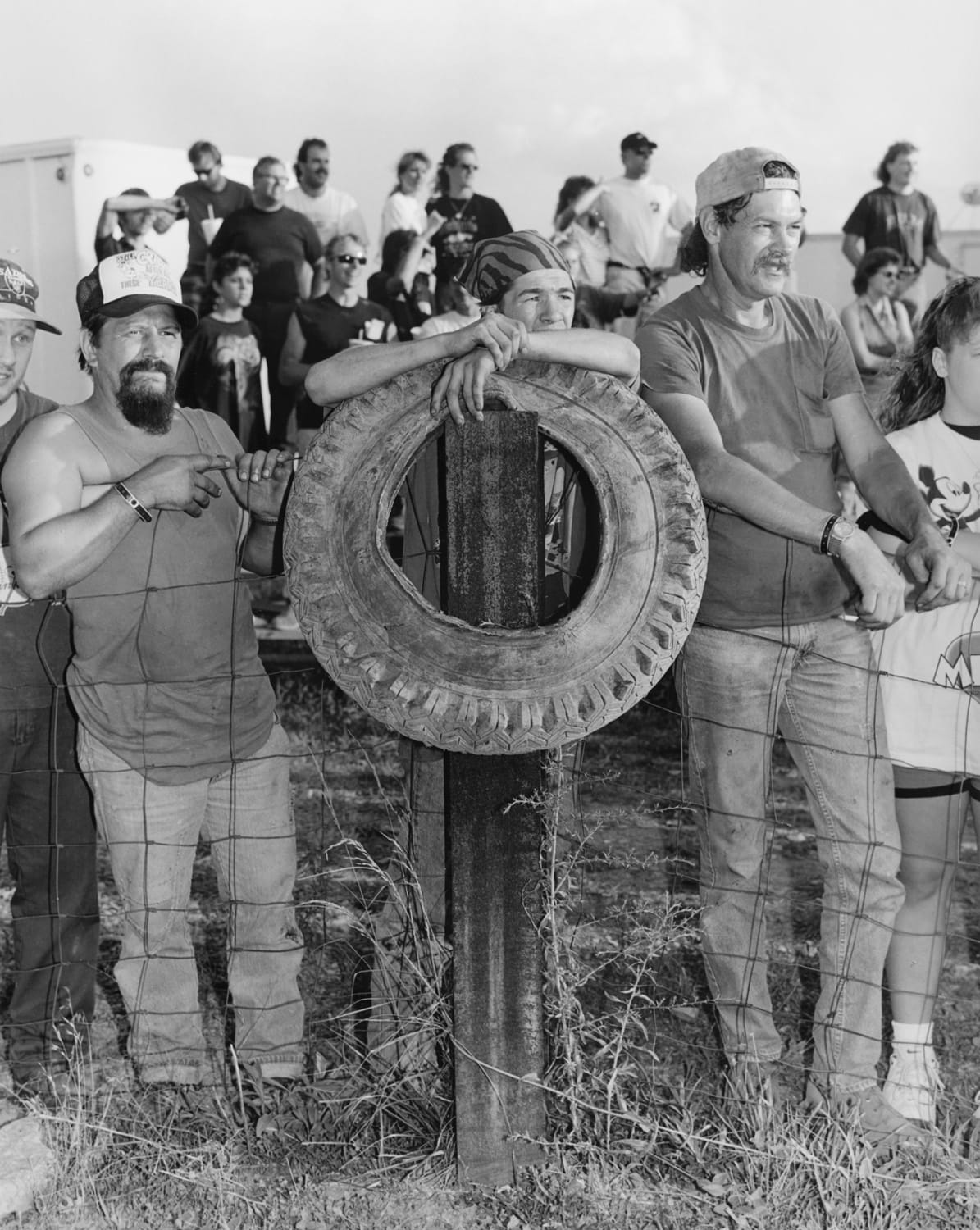 The photos in Derby were taken in and around Pennsylvania in the mid-t0-late 1990s while Graves taught at Penn State and Lipman worked as a mobile therapist and social worker in the rural areas nearby. “I witnessed first hand the brokenness of their domestic lives, their isolation, hardships, and even emasculation,” Lipman said in a recent email to Hyperallergic. But the duo's photos are not a simplified portrait of misery or suffering. On weekends, the carnivalesque chaos of the derbies “created a space in which everyone was equal,” Lipman reflected. “The boundaries between us and the drivers were erased. The drivers welcomed the attention, and felt safe opening themselves to the camera. They enjoyed being visible, performing their heroic feats, and were willing to expose their tensions and desires.”