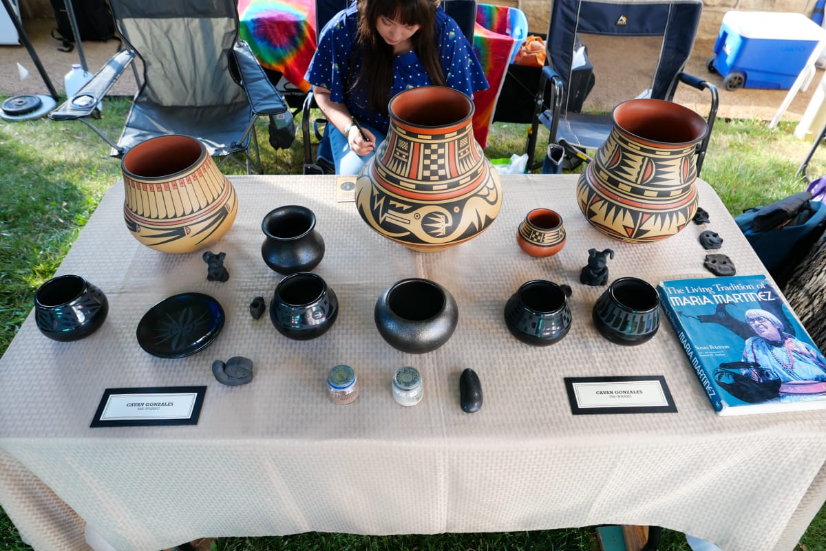Barbara Gonzales shared that she “apprenticed” with her great grandma, aunts, and uncles to master various techniques. As a young girl, sometimes she couldn’t go outside to play, but as she got older, she understood that clay, ceramics, and art were ways of opening doors of possibility and potential. Thus, both Barbara and Robert Gonzales fostered a home that centered on creative learning and teaching for their children and grandchildren. At Sunbeam Indian Arts Gallery she shared, “I want to show all the different creative expressions of my family,” which range from filmmaking, jewelry, painting, graphic design, and sculpture. All these interdisciplinary creative expressions center Indigenous storytelling, and while this weekend showcased their pottery, Gonzales also attended her granddaughter Charine Pilar Gonzales's film screening, River Bank (Pō-Kehgeh) ” (2023), which she also stars in. Pilar Gonzales credits working with clay to being a filmmaker because it is with clay she first learned about “collaborating” work with others, “listening” to the land, and allowing the story to fully take shape. She shared, “Sometimes the story will take its own direction and you have to respect that spirit. Same with clay, you have to respect that you are working with the spirits.”