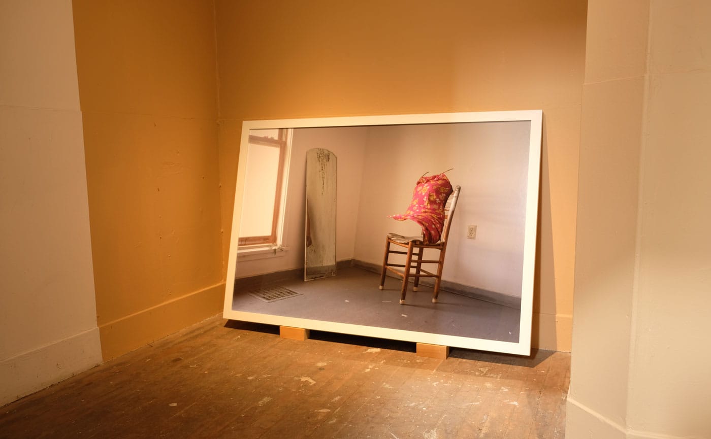 Curator Lian Ladia capitalizes on the eccentric physical profile of Incline Gallery. Once a mortuary, the gallery’s successive, staggered ramps were used to transport human remains into and out of the building. Now, they comprise one of San Francisco’s unique art-viewing experiences. “Bodyless (4899)” (2019), the first of two large digital photographs, sits on the landing between the first and second ramps. A vivid pink floral print dress looks as though it is worn by a seated figure, but the figure is absent. Opposite the chair, an upright mirror captures the missing figure’s arm. Visually, the disembodied limb evokes memories of the dial-up internet age and how long it took for images or other data to download completely. The composition suggests a tantalizing hint of knowledge, partial and unfulfilling — particularly Arteche’s adolescent digital searches to connect with her Filipino cultural heritage.