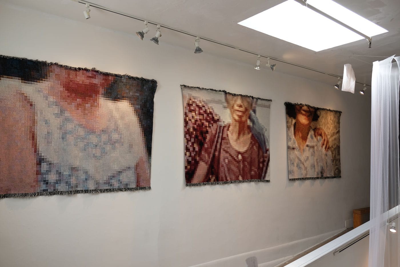 Ascending the final ramp, our first glimpse of the hanging pieces requires us to look up. Observing the tapestries from below, we fix our eyes on the machine-made objects like we may gaze upon stained glass windows in a cathedral, searching for knowledge in enigmatic faces. We may see, for the first time in the context of an art institution, brown-skinned women as more than foreigners or anonymous individuals at work in a Western economic context that treats them as Other and undervalues their contributions. We may look up to them, as Arteche does, with a longing to know more. After descending the gallery ramps, how many of us will look again at the framed family photos that open the exhibition? Will our perception shift, taking into consideration the filters through which we perceive cultures that may not be our own?