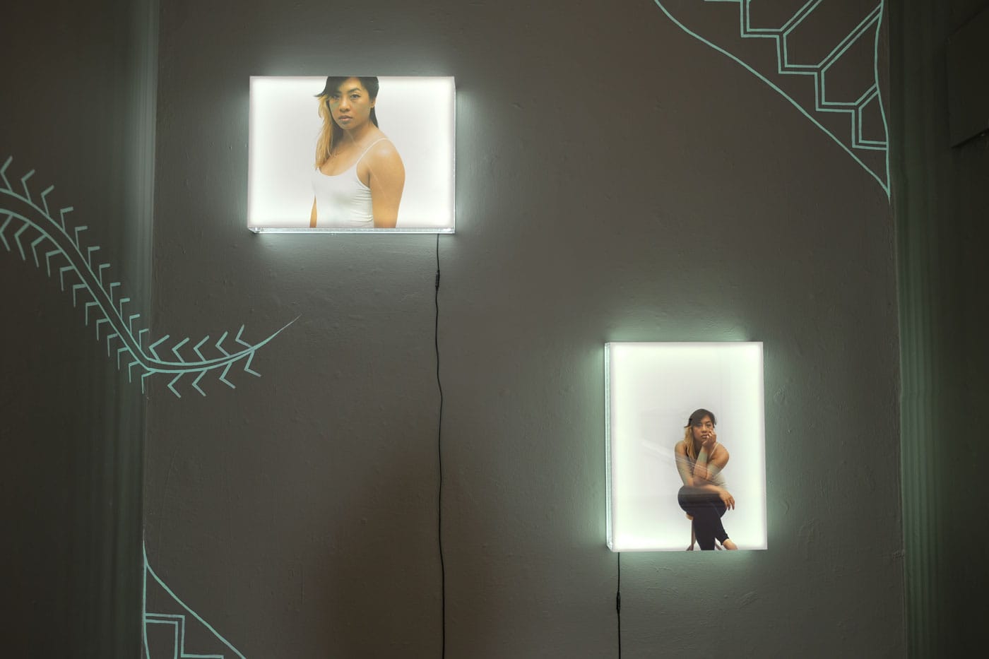 The Curved Body of a Pixel reflects Arteche’s earnest work to understand the historical and contemporaneous cultural traumas and triumphs that mold her, from Spanish and American colonization of the Philippines, to 21st-century economically-forced migration. “Ta,too Project I and II” (2014) visualizes this intergenerational battle through self-adornment. Referencing Carlos Villa’s (1926-2013) 1969 project Tat2, Arteche digitally applies delicate Filipino linear patterns to her face and arms. The electric green lines appear superimposed on her skin, not absorbed as actual tattoos are. The series serves double duty; paying homage to Villa’s work as it exposed colonialist homogenization of indigenous artistic practices, and marking Arteche’s path into deeper understanding of her cultural roots.