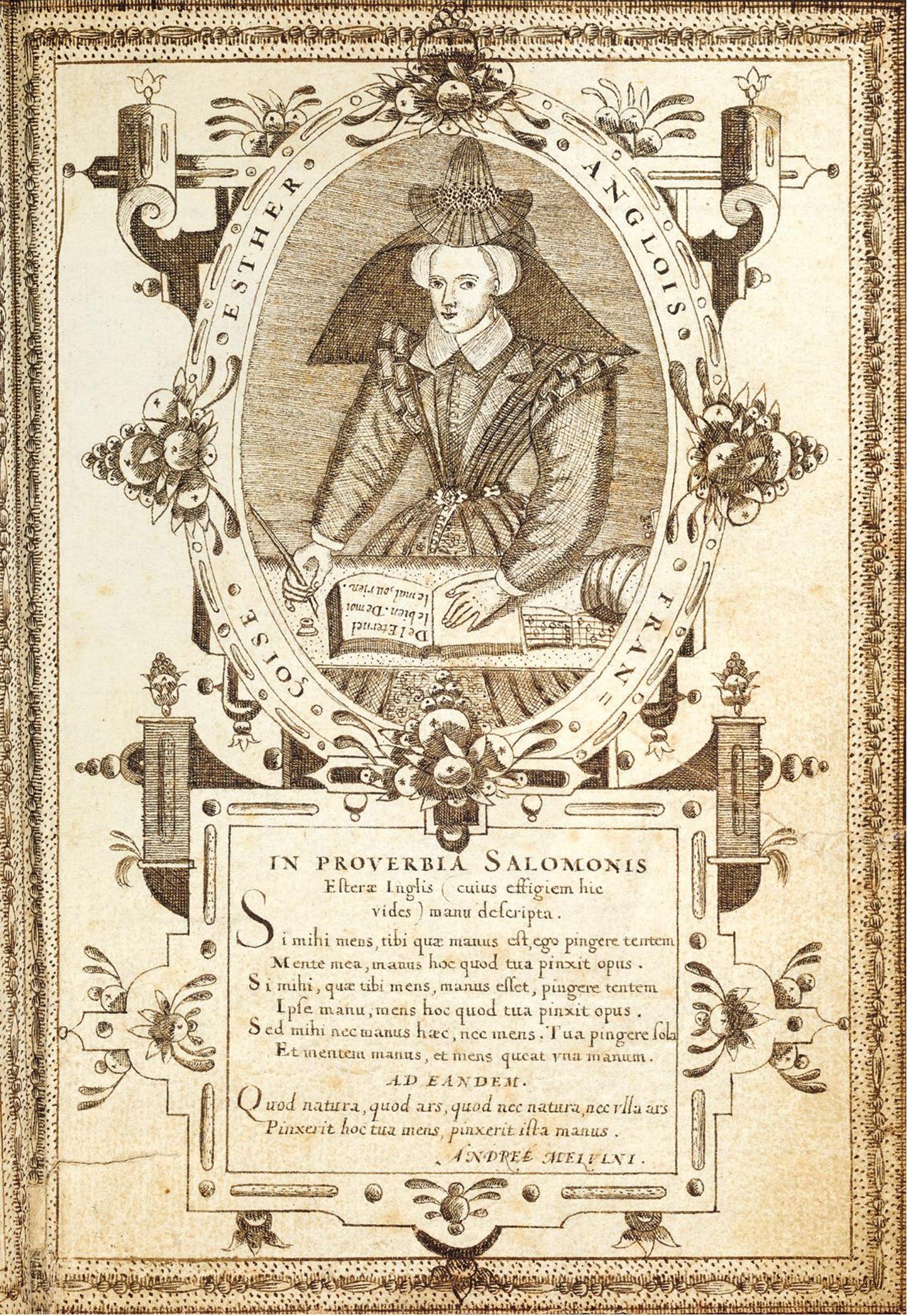 The final section of the book is dedicated to "Scribes and Calligraphers" — people who earned their livelihoods by setting words to paper. Though their names are less well-known than some of those in other sections, the works of handwriting in this section are especially phenomenal, making it a grand conclusion. In an excerpt from a 1599 edition of Proverbs of Solomon lettered by Esther Inglis, for instance, multiple forms of her handwriting are on view, including roman, italics, and capital-letter text around the border of a self-portrait — as well as the words that depiction, in turn, inscribes into the page.