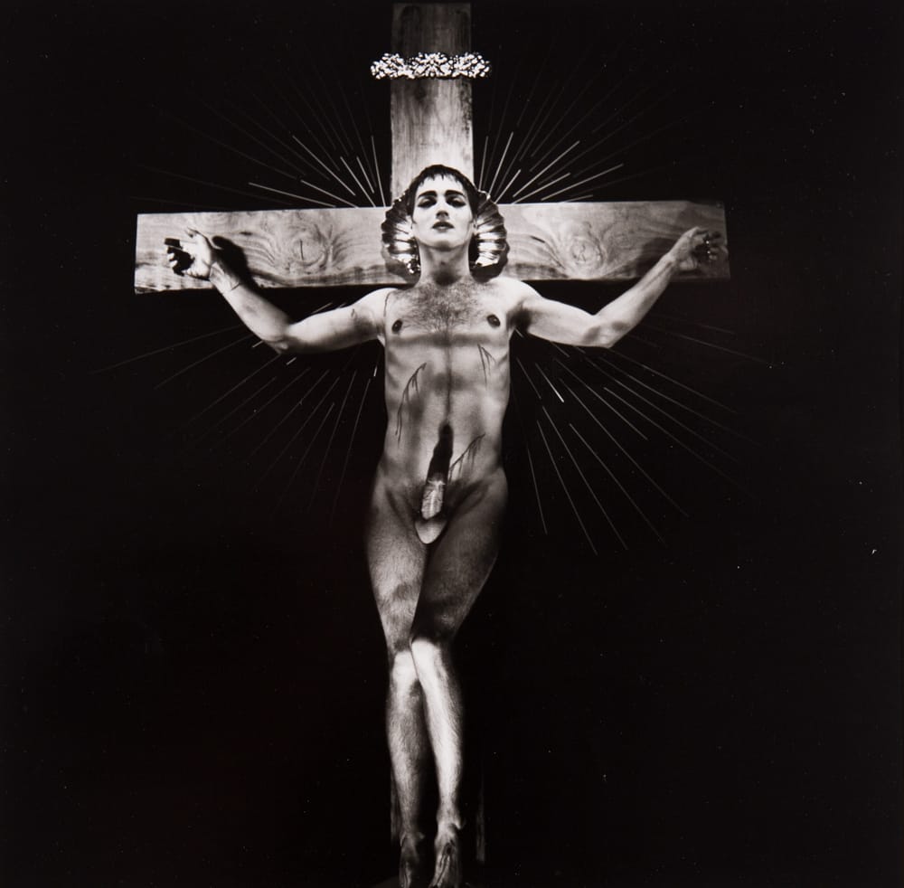Today the sentiment might sound like a hippie cliche, but the surreal photographs these experiences inspired are anything but. After leaving Formentera, Arnold created hundreds of otherworldly, black-and-white tableaux vivant — gender- and mind-bending takes on imagery from classical mythology and religious texts (i.e. one photo entitled “Fag Jesus”). Here, body-painted models are strung up on gleaming crosses, porcelain dolls sprout from a goddess head in mandala-like patterns, and angels with Illuminati-pyramid loincloths emerge from scallop shells.