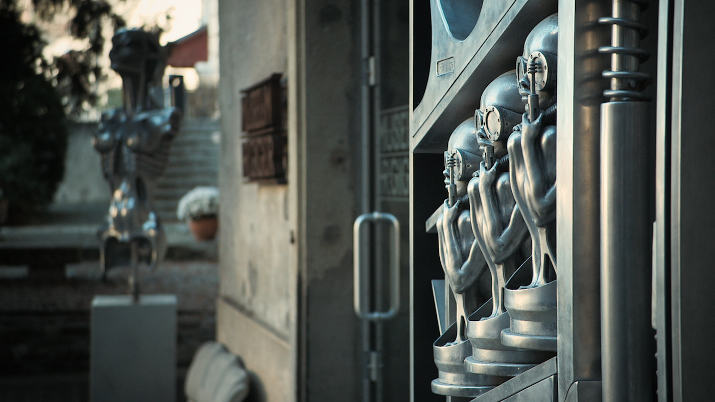Cinematographer Eric Stitzel’s photography revels in the gloom of Giger’s art. The film features the typical artist documentary shot of a camera following an artist from behind as he or she traverses a studio. In this instance, the shot becomes a thing of horror as terrors that Giger produced linger in the margins of the frame. The Giger estate is also filmed in a similarly disturbing manner. In the opening, Steadicam shots around the grounds mimic the point of view of a slasher like Michael Myers or Freddy Krueger stalking prey. Low tracking shots creep along the train tracks running through an installation outside the home. Crane shots soar like phantasms through and over the skeletal trees surrounding the building. Borrowing the visual syntax of a horror movie allows Dark Star to mirror Giger’s style.