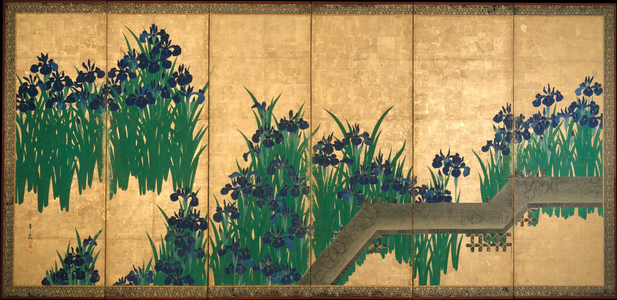 The screens’ leaves and blooms will soon fall, representing life’s impermanence. Maple and cherry trees evoke the spring and autumn, themes that appear in poems written on the tanzaku strips of paper hanging from the tree’s branches. These contain verses taken from imperial anthologies that would have been familiar to the screens’ educated spectators. Empress Tōfukumon’in displayed this screen during official gatherings to spark conversation and reinforce her status. As a sign of her wealth, she commissioned 30 different calligraphers to contribute to the screen’s painted poems.