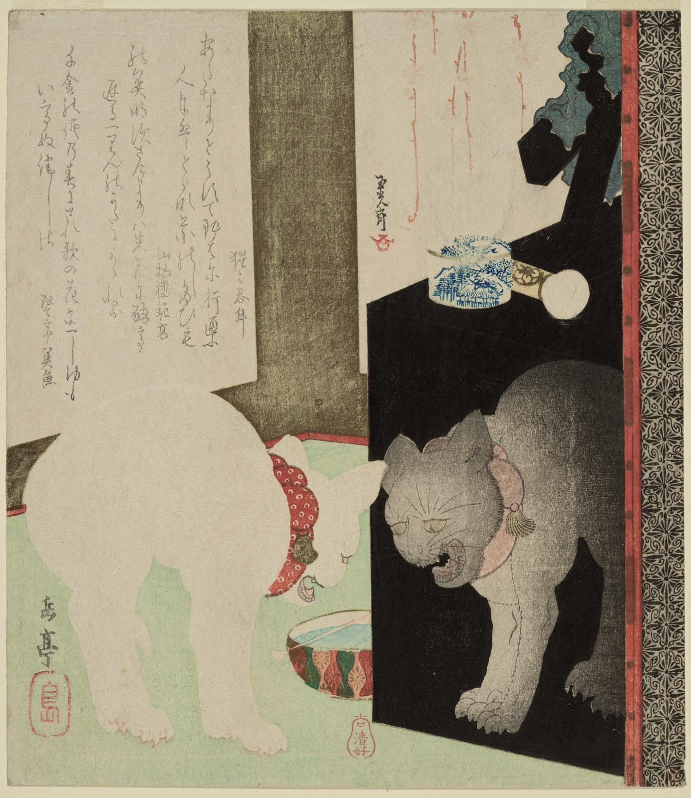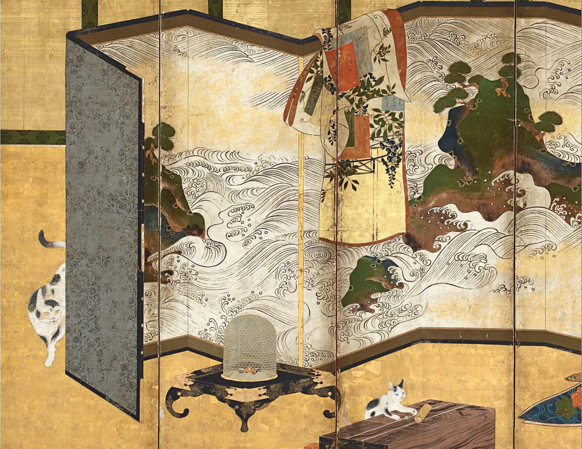 Eventually, with the arrival of the Edo period and the rise of the merchant class, screens made their way to other sectors of society. These new patrons favored more everyday subjects, including what is known as “Whose sleeve?” scenes, which depict clothing, bags, pets, and other personal effects gathered informally together. These screens were joined by smaller makura byōbu, or “pillow screens,” that kept drafts away from working class people while they slept. Another more easily accessible object that mirrored the screen’s segmented, collapsible visuals was the folded paper fan, or ōgi, which emerged in the 10th century.
