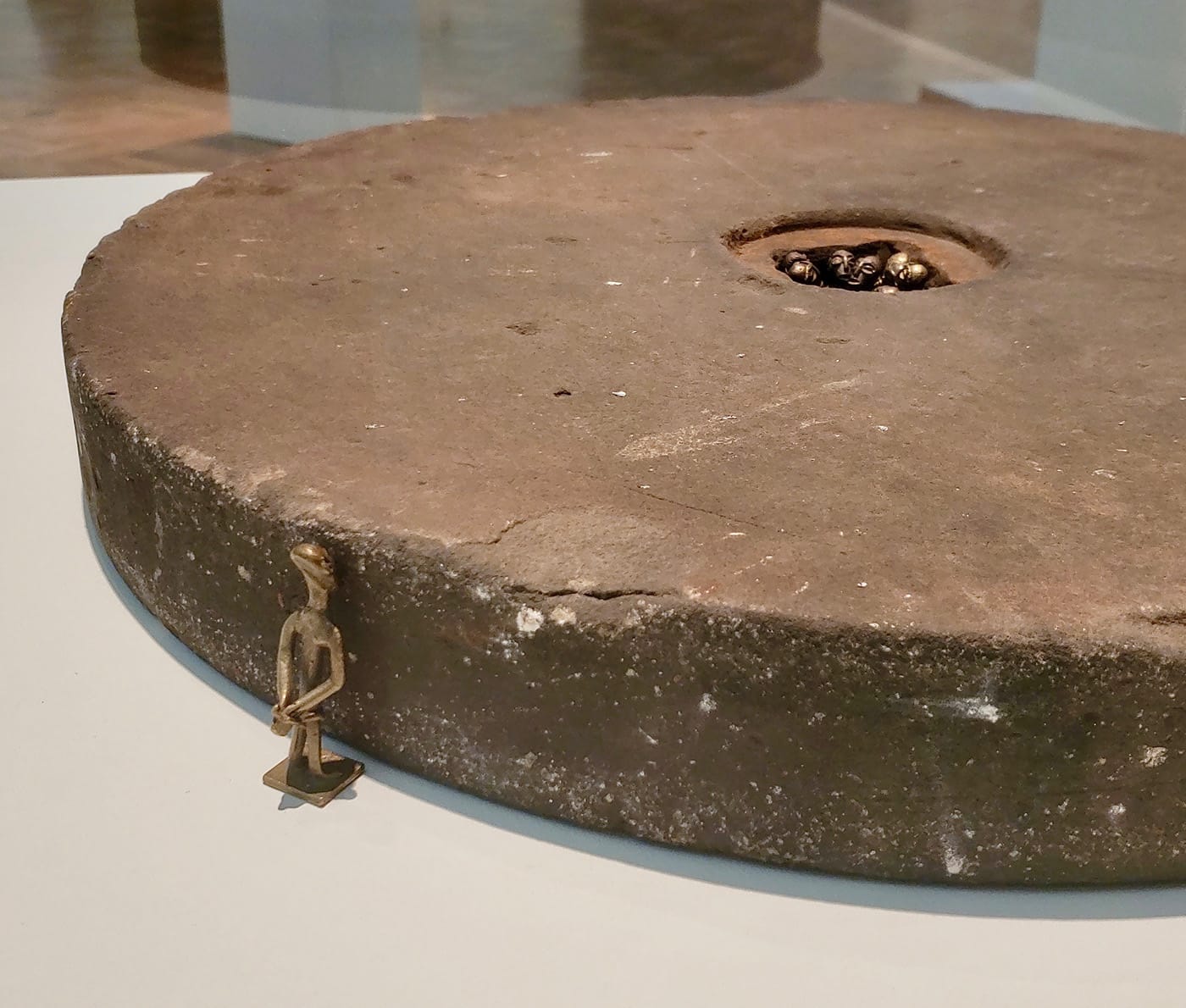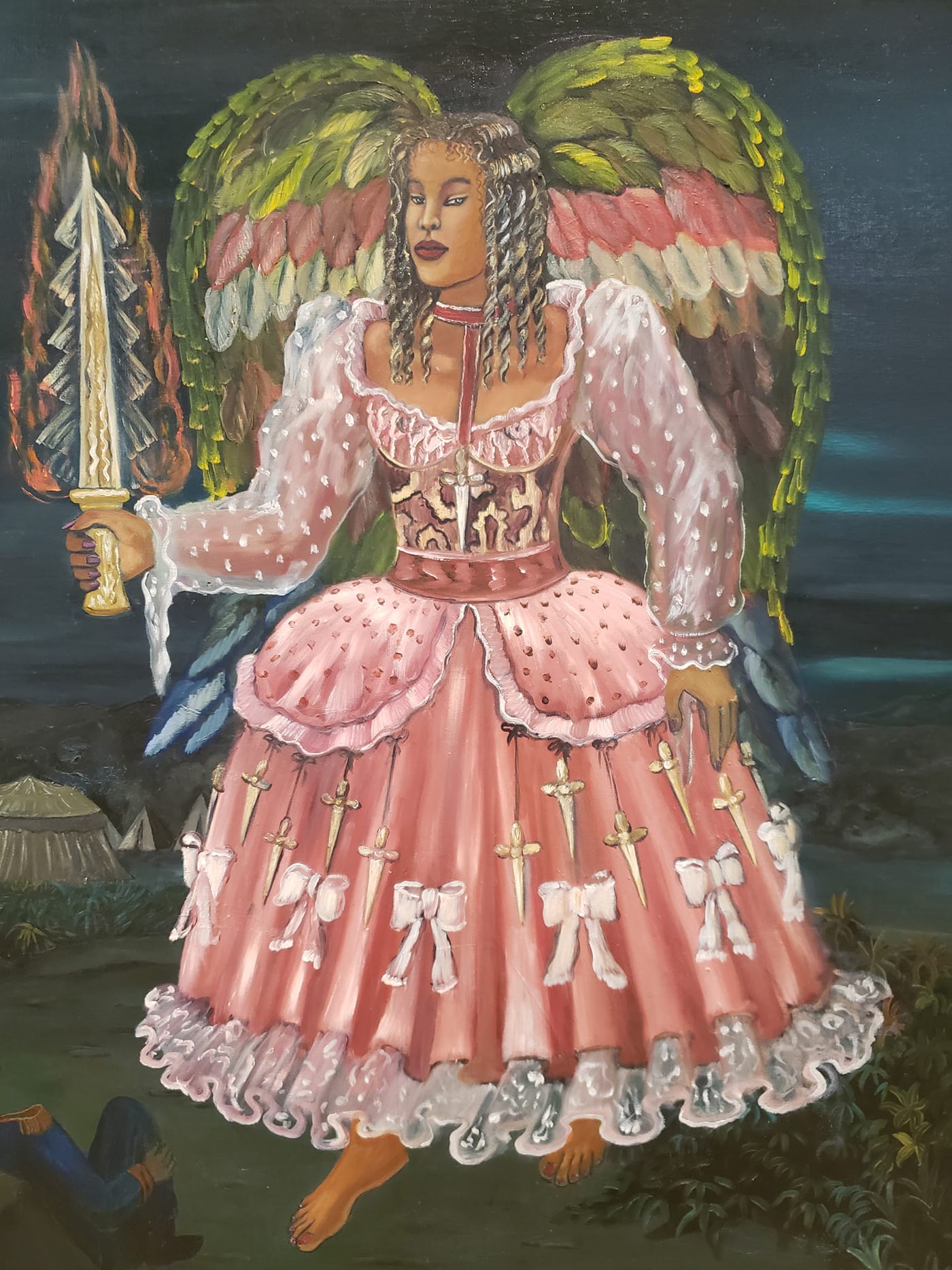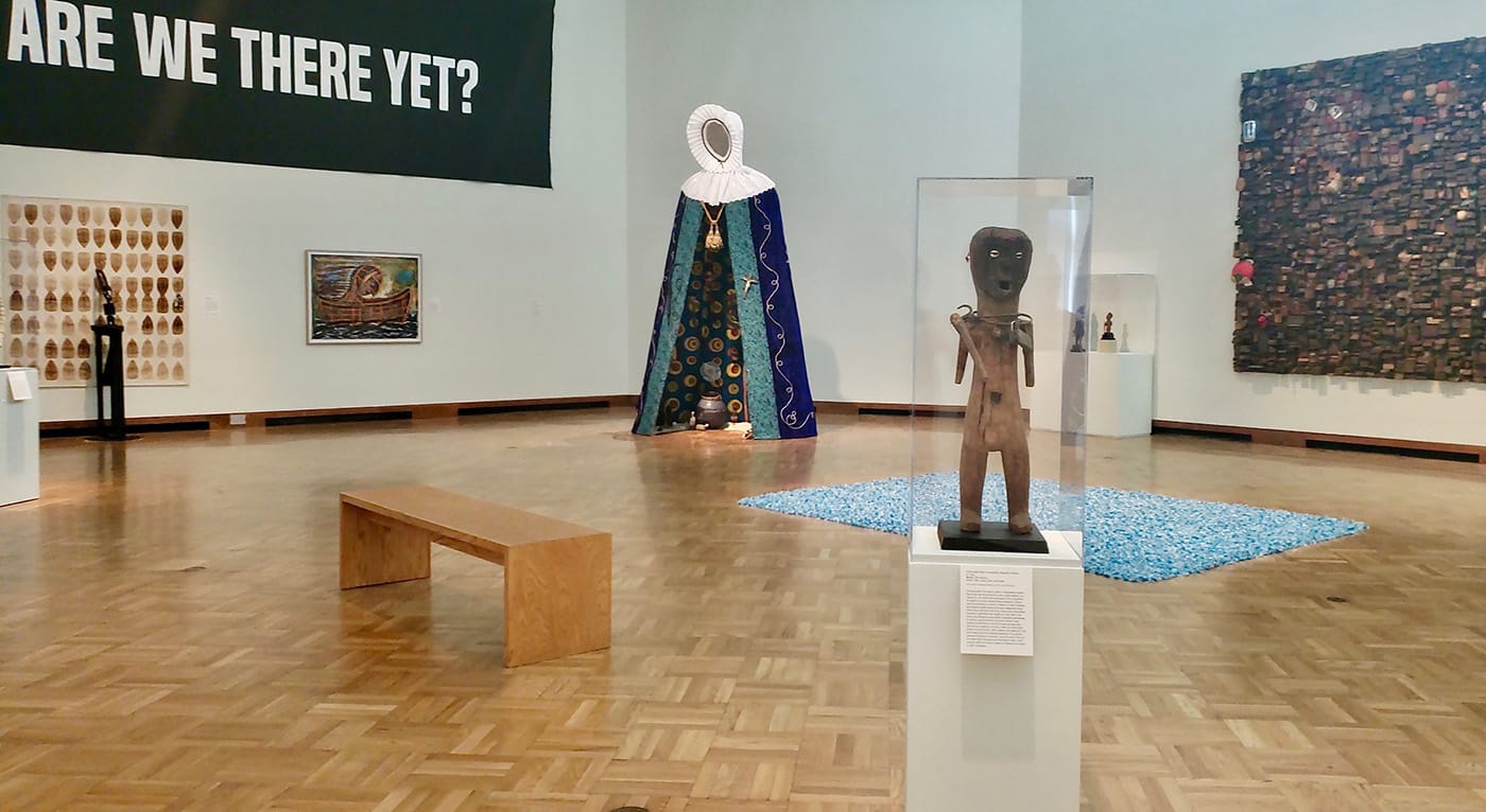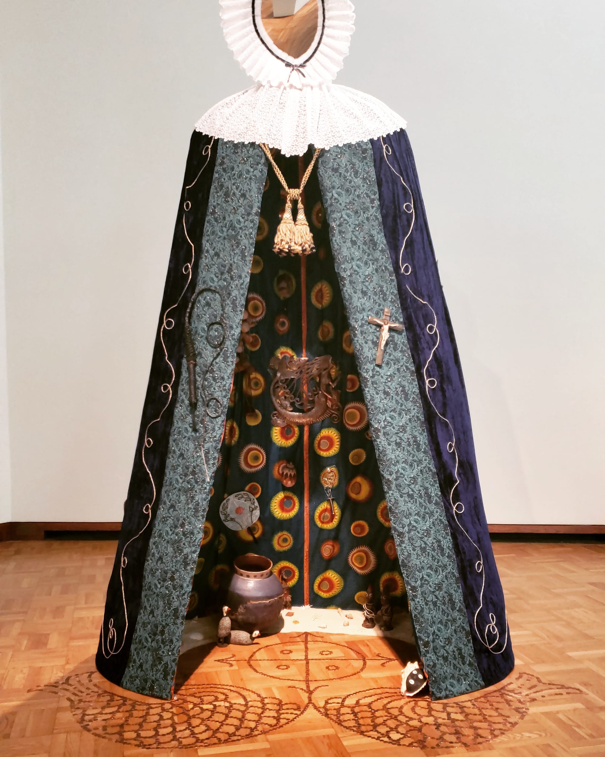 “We met shortly after I was hired in 2017,” said Gyorody, during a gallery tour with Hyperallergic. “And [Rarey] mentioned, sort of offhandedly, that 2019 would be the 400-year anniversary of the arrival of [the first] slave ships in the United States.” This sparked a discussion that evolved into the mounting of Afterlives, which brings together works from the United States, Europe, Latin America, the Caribbean, and Africa, drawn mostly from the AMAM collection, and supplemented by several loans and a site-specific commission by José Rodríguez. This work, titled “\sə-kər\” presents as an 12-foot Virgin of Regla — patron saint of the city of Havana and an adaptive form of the Orisha Yemayá, who protects the seas — identifiable by her regalia though the garments have been hollowed out to create a kind of open teepee, and the face has been replaced by a mirror that captures the visage of the viewer as she approaches.