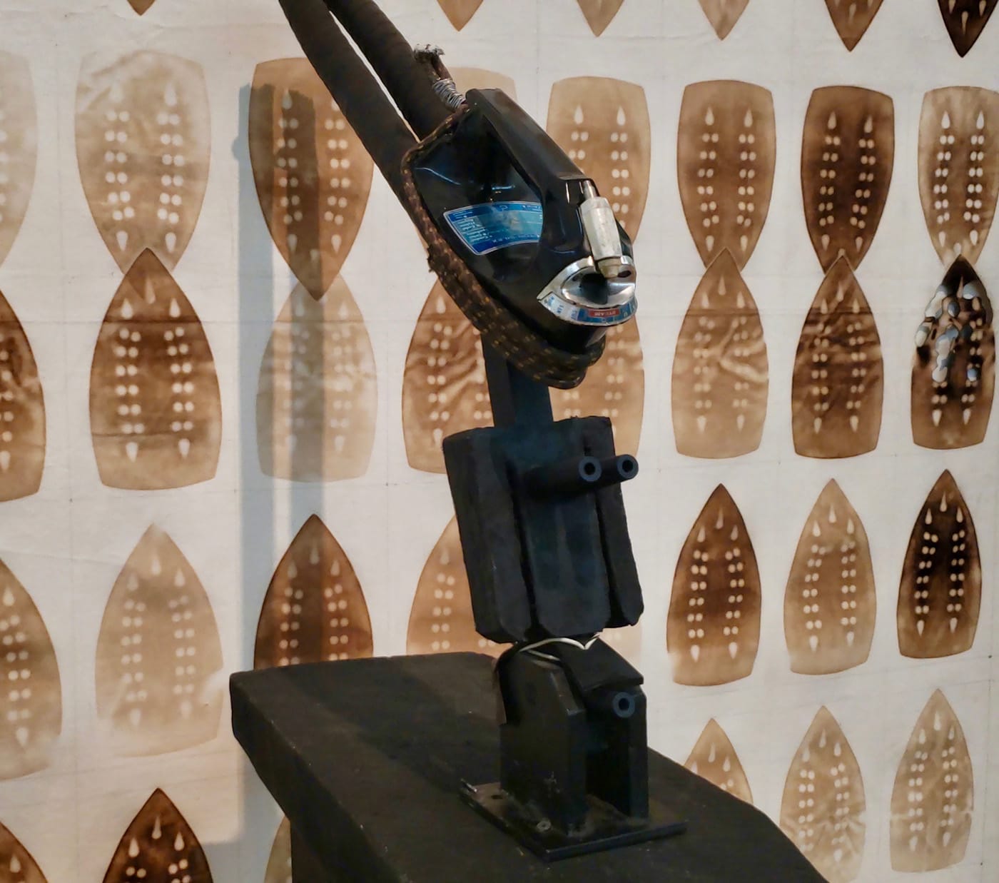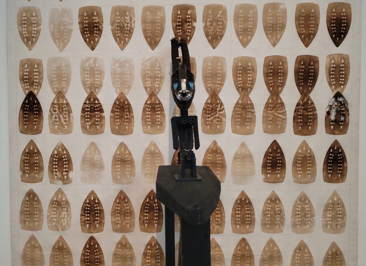 Afterlives of the Black Atlantic hits all the right notes, bringing a stunning variety of media, sources, and perspectives into dynamic conversation. Each work carries its own weight, but moving through the gallery creates a number of arresting tableaus. In perhaps the most startling reveal of the show, “For Proctor Silex (Evidence and Presence)” by Willie Cole appears, from afar, to be an African figurine displayed against a backdrop of thick patterned cloth. Drawing closer, the figure transforms into an industrial iron, the very implement used to burn the motif into the canvas. This optical shifting between sacred figure and labor implement, decorative adornment and burnt offing, encapsulates the polarities of diasporic experience, and provides one of many moments that will linger in this space of examination.