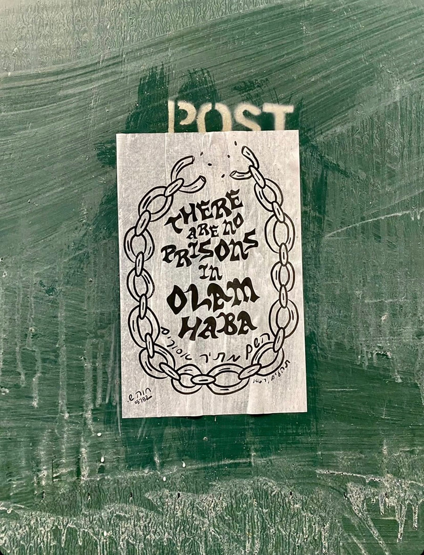 Of particular relevance in the current political climate in Israel and the Occupied Palestinian Territories is an image designed by Shapiro in 2022 and made freely available through the JZA for open-access use. The image is a broken chain that features the statement: "There are no prisons in Olam Haba" — a Hebrew term that translates literally as "the coming world" and is generally interpreted as the Jewish version of the afterlife. However, Shapiro sees it a little differently.