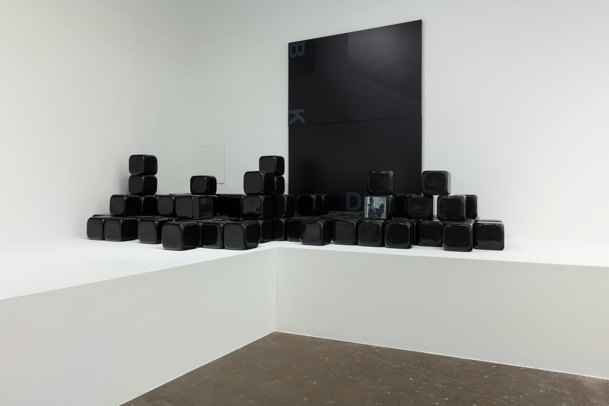 Take, for instance, Thomas Glassford’s 1995 Autogol series, in which mysterious, seed-like forms are painted with delicate floral designs that recall Guadalajara’s decorative arts heritage. A few steps away, Alejandro García Contreras’s “My Funny Valentine” (2021) pairs erotic imagery on spiky clay vessels with spidery chains, sand, and glass drops in a kind of occult altar. Nearby, a group of tangy-colored bed pans makes up John Baldessari’s “The Artist Is a Fountain” (2022). In other cases, clay transforms into a shimmering golden urn (Jorge Pardo), uniform black cubes (Adam Pendleton), and even a football-sized tomato (Pardo again).