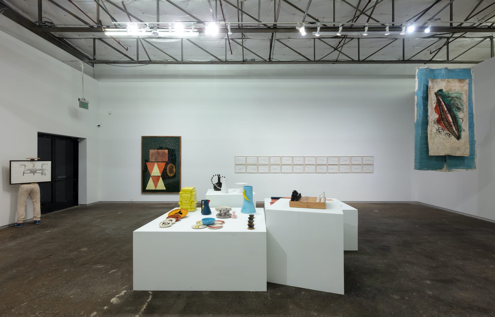 Not everything on view is clay-based: some of Cerámica Suro’s artists have chosen to work with materials like bronze, aluminum, fiberglass, blown glass, wood, and steel, and the Suro collection also includes textiles, collages, photographs, paintings, drawings, and sculptures. A smaller section of the exhibition is dedicated to the factory’s very active work with industrial design and architectural projects, teaming with designers and architects to manufacture objects, many of which can be seen in restaurants, public spaces, and private homes around Dallas. But the majority of the exhibition — and the part that is most engaging to experience — focuses on ceramic works created by invited artists collaborating with factory staff.
