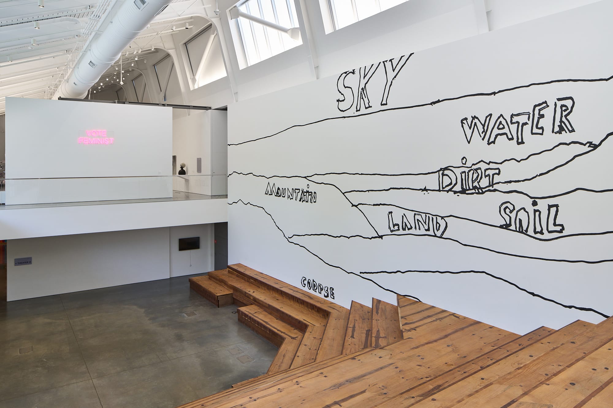 The first two artworks visitors see as they enter the museum are Michele Pred’s neon wall piece “Vote Feminist” (2020) and a landscape mural by Luchita Hurtado, “I Live Here” (2020–21). While “Vote Feminist” might have seemed a better fit for 2020 when it would have premiered before the Presidential election, given recent anti-abortion legislation in Texas and the California recall election aiming to replace a pro-choice Democratic governor with a front-runner Republican who opposes all abortion, voting feminist is not just always on the agenda, but feels more essential than ever.