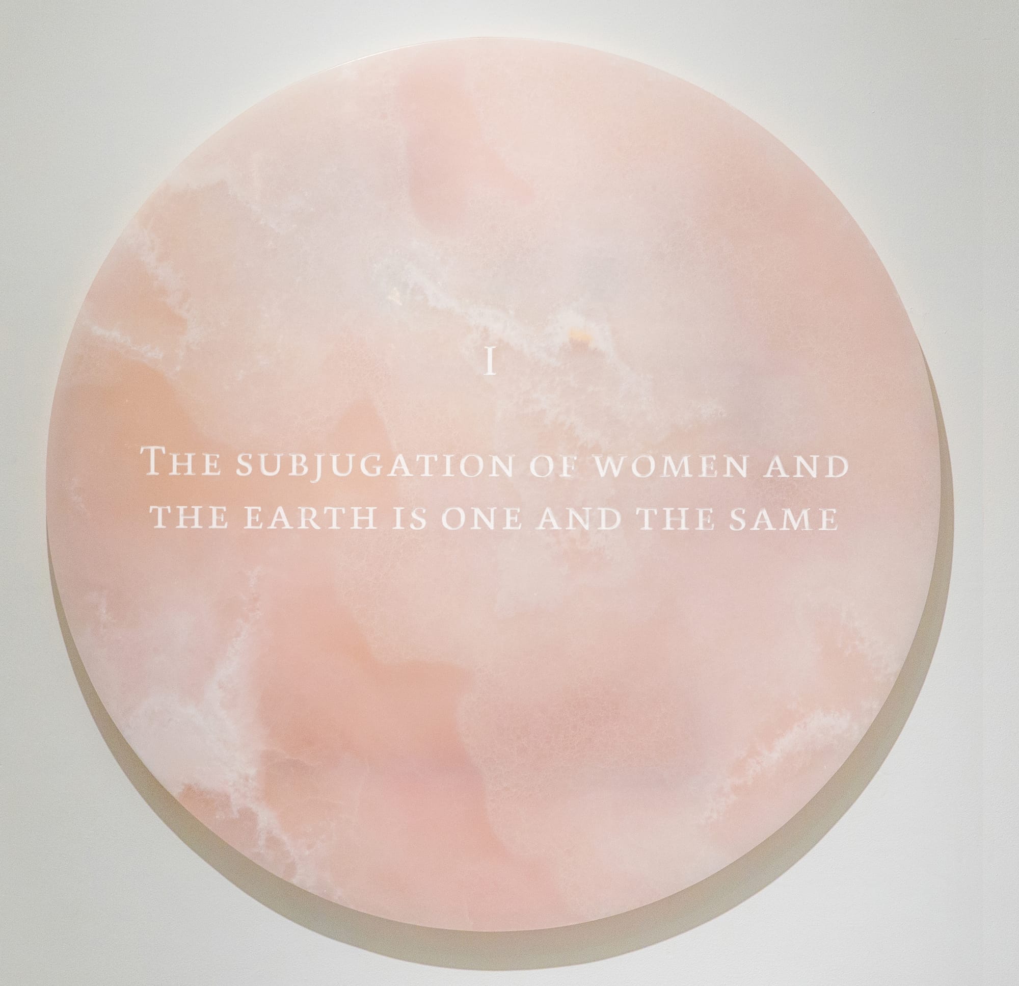 So much of the art in New Time is savvy in assessing the past while pointing a way forward. I’d say New Time is urgent — a much overused word — but urgent doesn’t begin to express how much we need what it offers in our time of catastrophic emergencies. The wall leading out of the main galleries is lined by a series of large rose quartz discs, a collaboration by five artists — ANOHNI, Kembra Pfahler, Johanna Constantine, Bianca Casady, and Sierra Casady — from their series 13 Tenets of Future Feminism. The first disc is inscribed: “The subjugation of women and the earth is one and the same.”