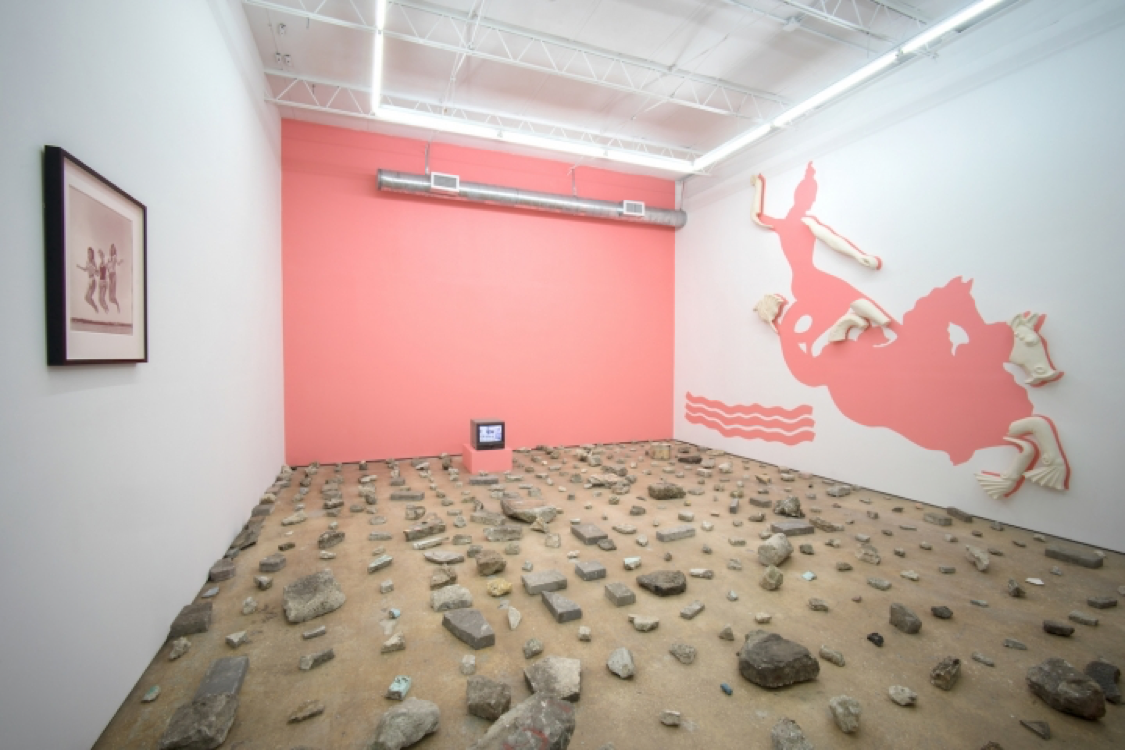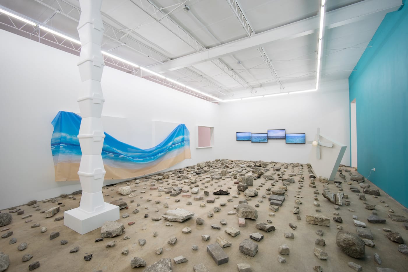 Tom Scicluna examines this literally with “Area” (2017), lining the entire floor of the gallery with a grid of rocks and detritus from the nearby train tracks, shards of dismantled buildings, and hunks of limestone. On the show’s opening night, it rained until the streets flooded; the floor was wet and rocky, and visitors were comically conscious of their movements, an accidental metaphor for navigating a city affected by sea-level rise. Ironically, in their rush to stay dry, few could hear Cara Despain’s “Sea Unseen” (2016), an audio installation tucked into a storm drain, in which the sea describes its drowning of the city, or see Nicole Doran’s “Holding on” (2017), a ceramic planter depicting a hand grasping a phallic cactus — reaching, as it were, for dry land. When I visited a week later, the rocks had become ophidian, snaking through the gallery in the shape of visitors’ footsteps. (Anthony Spinello, the space’s curator and owner, clarified that most visits to the gallery are by appointment, and the rocks are cleared per visitors’ needs.)