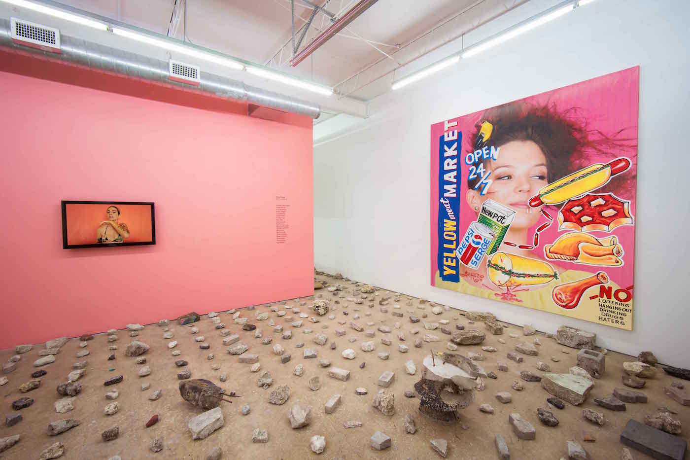 Their piece “Yellow Meat Market” (2015) features the Toussaint’s classic bodega iconography, this time totally ribald, with a hot dog leaking its condiments onto the lips of an unassuming model. Surely this is another Miami’s façade: its sexualization extends to its wetness, heat, the ascribed beauty of its inhabitants, the gross fetishization of its ethnic populations. “Misterio Tropical” (2016) a video by Angel Garcia, sits cattycorner to “Meat Market,” though you can hear it everywhere — its soundtrack is Cuban singer Willy Chirino’s “Soy Guajiro,” distorted past recognition. Garcia, Cuban herself, stares at us, doe-eyed and suggestively eating a mango, not the most easily eroticized fruit. At once titillating and unsettling, her willingness to coyly “perform” belies her total, if momentary, control. The sexualization of crass cultural stereotypes further weaponizes them, and Garcia briefly upends their ultimately backward nature. It took a while for me to realize that the video was, in fact, literally backward.