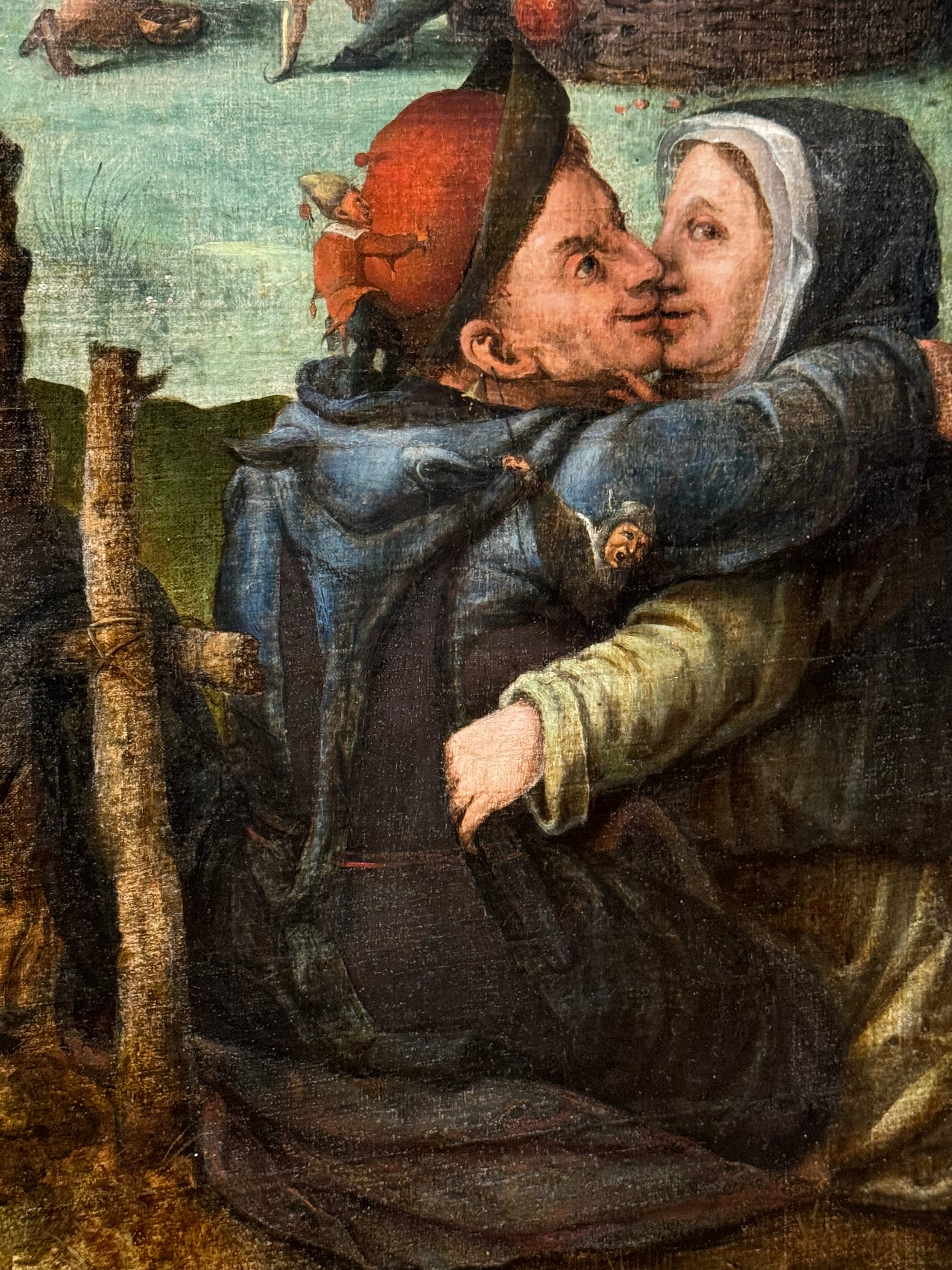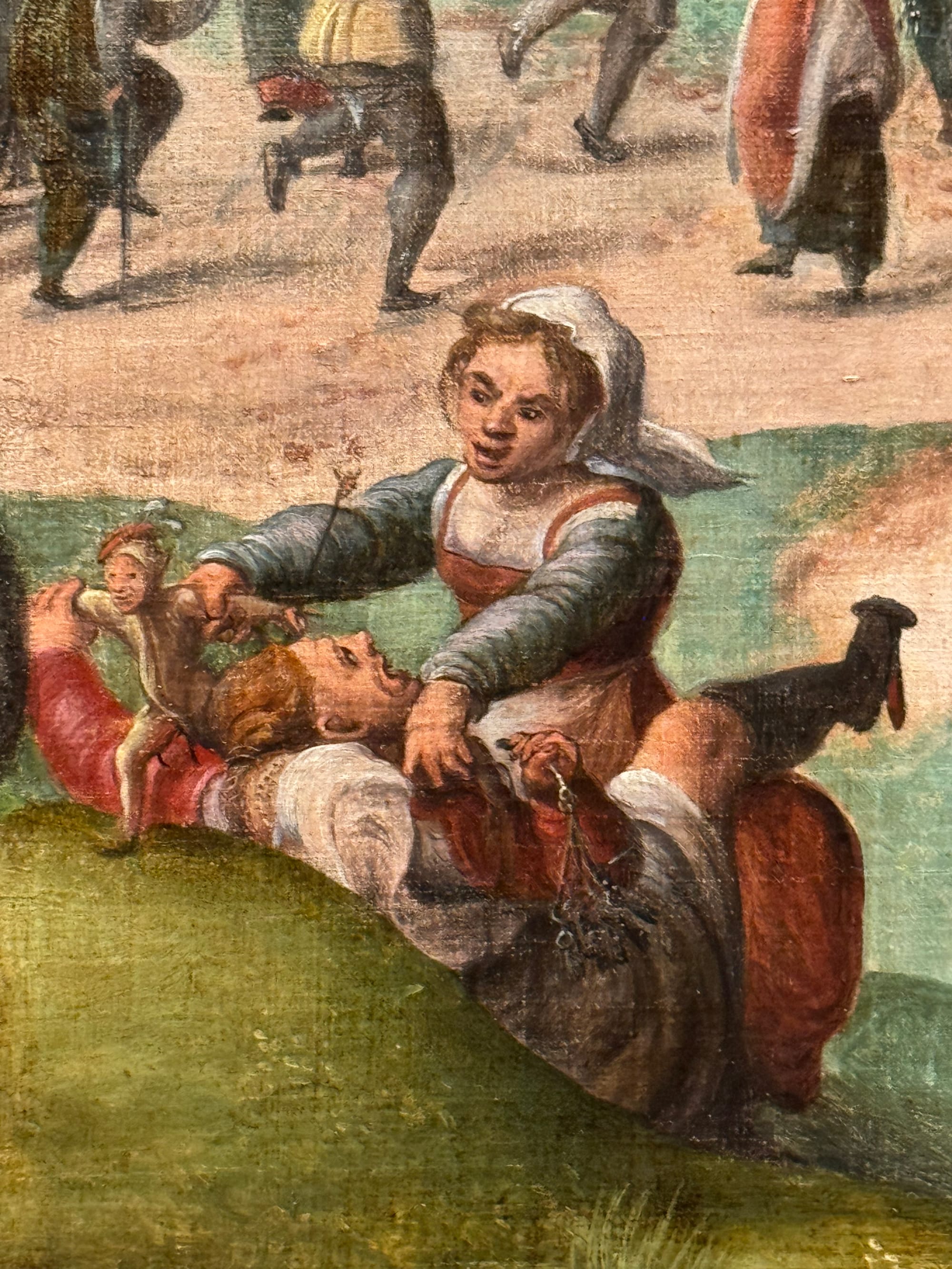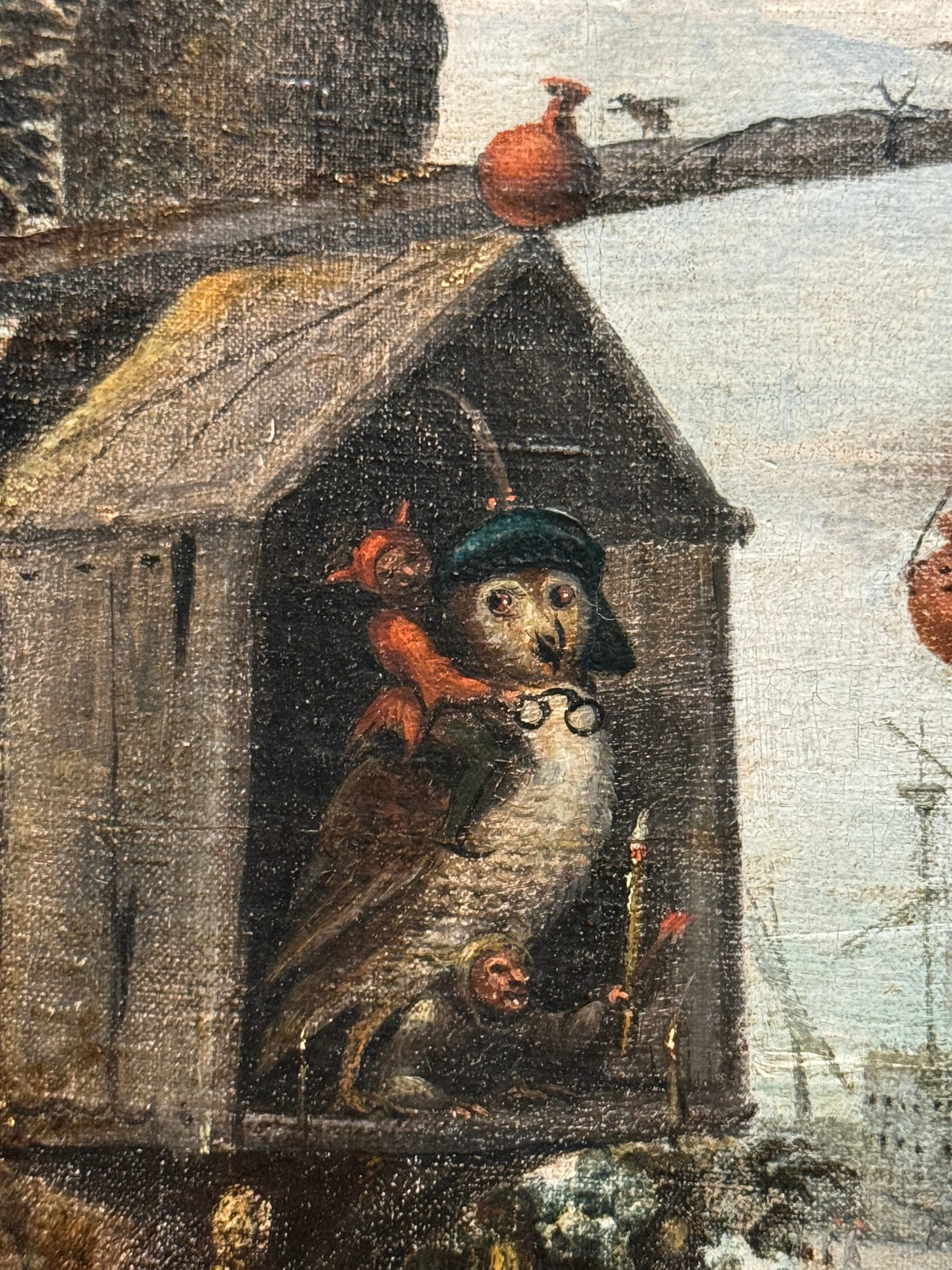 The fool also appears in peasant scenes once dubbed genre paintings — cautionary tales of unbridled desires in everyday people. Frans Verbeeck's colossal “Mocking of Human Follies” (1550) (which broke records when it sold at auction 10 years ago) is composed of vignettes that depict self-destructive overindulgence. The revelry includes inebriated peasants spilling out from the tavern; a caged devil hanging above a circle of dancers; a nun kissing a man; and a woman mounting a man in plain sight. Over in a tree on the far right, the devil removes a pair of spectacles from an owl and climbs on the owl’s back as if about to take flight. The painting’s scenes establish a direct connection between foolish acts and the work of the devil.