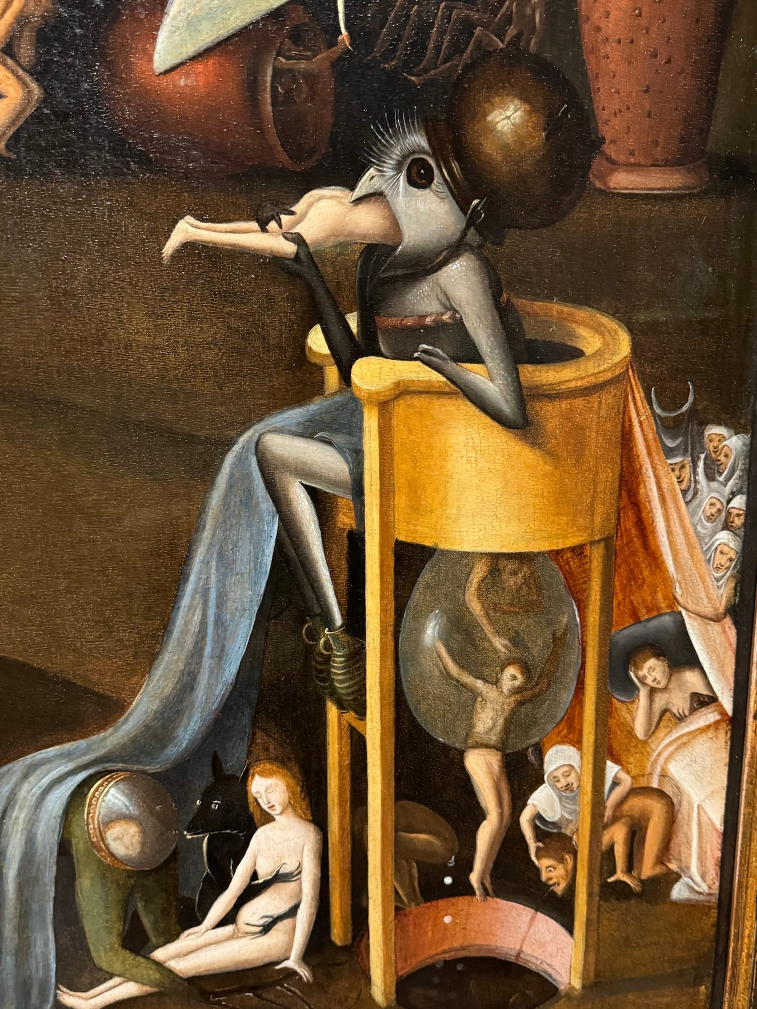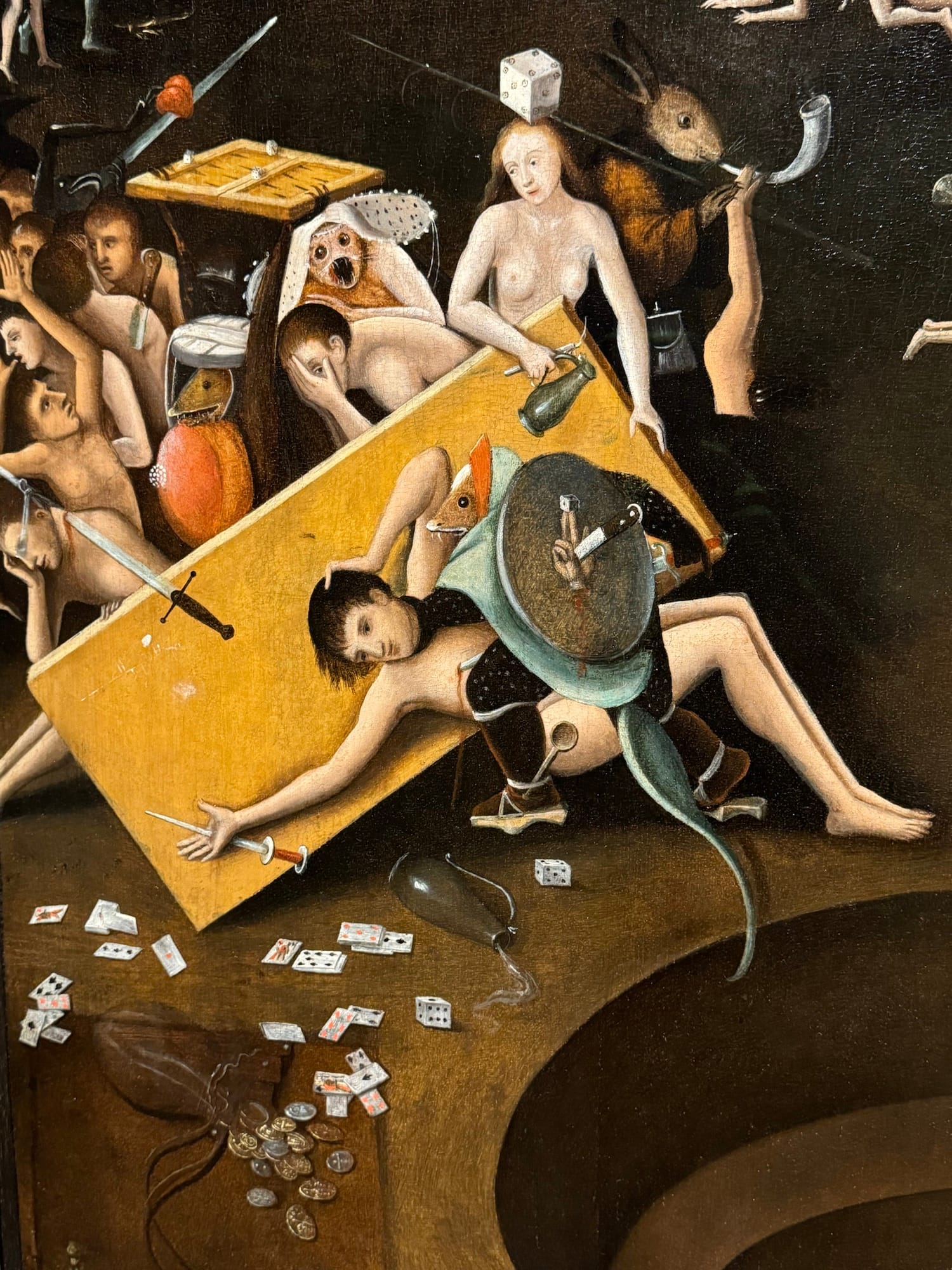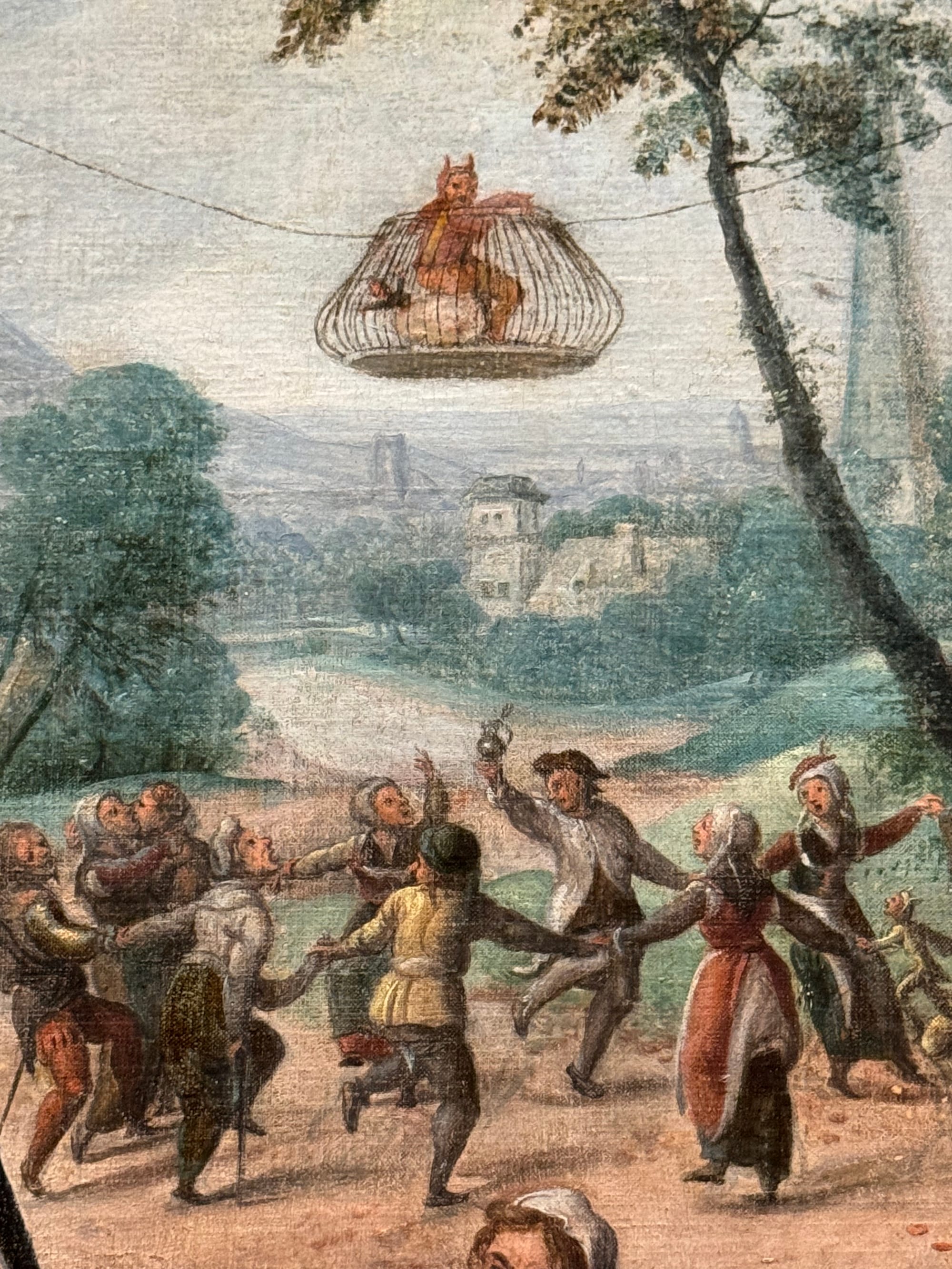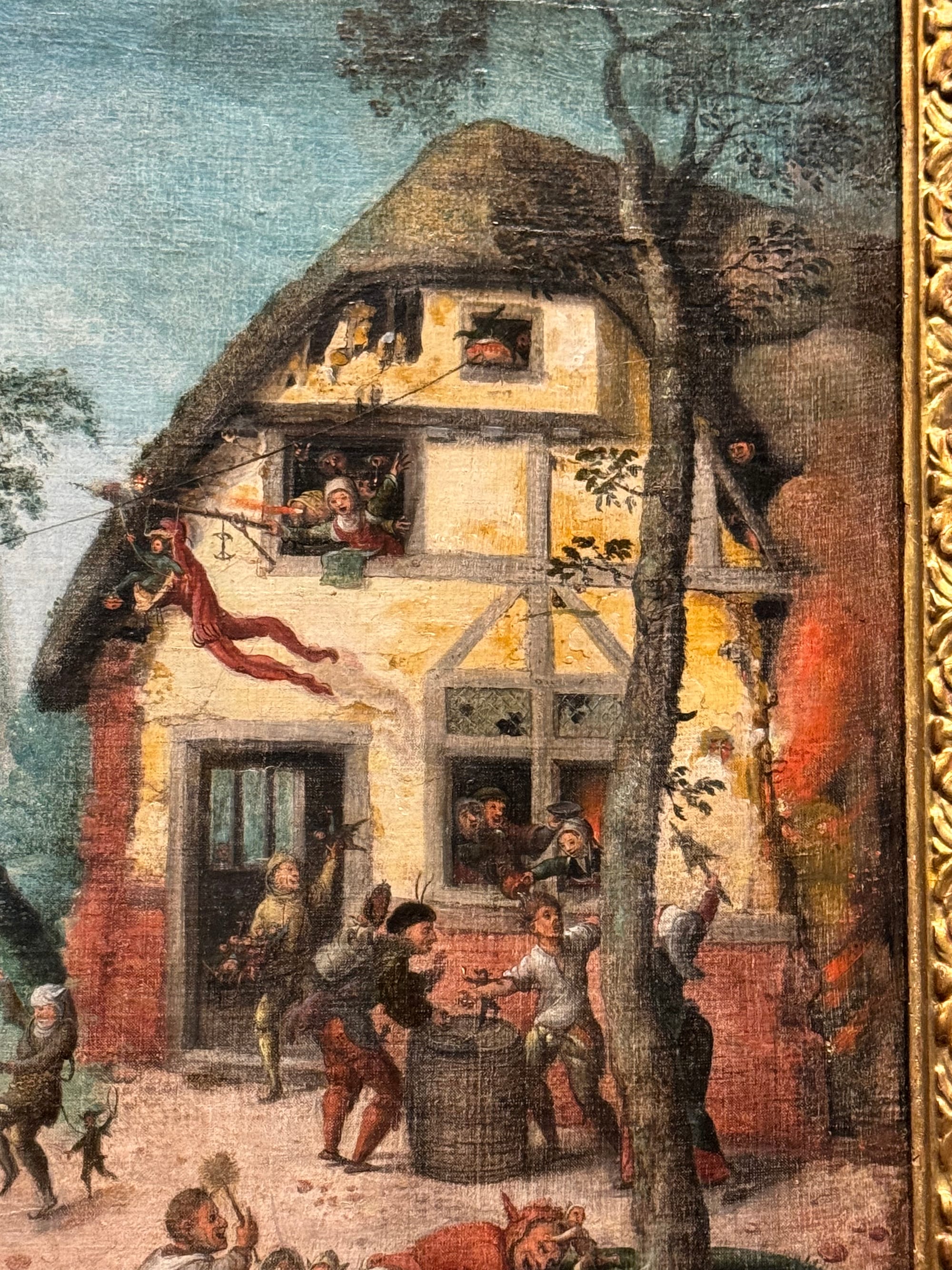 The fool also appears in peasant scenes once dubbed genre paintings — cautionary tales of unbridled desires in everyday people. Frans Verbeeck's colossal “Mocking of Human Follies” (1550) (which broke records when it sold at auction 10 years ago) is composed of vignettes that depict self-destructive overindulgence. The revelry includes inebriated peasants spilling out from the tavern; a caged devil hanging above a circle of dancers; a nun kissing a man; and a woman mounting a man in plain sight. Over in a tree on the far right, the devil removes a pair of spectacles from an owl and climbs on the owl’s back as if about to take flight. The painting’s scenes establish a direct connection between foolish acts and the work of the devil.
