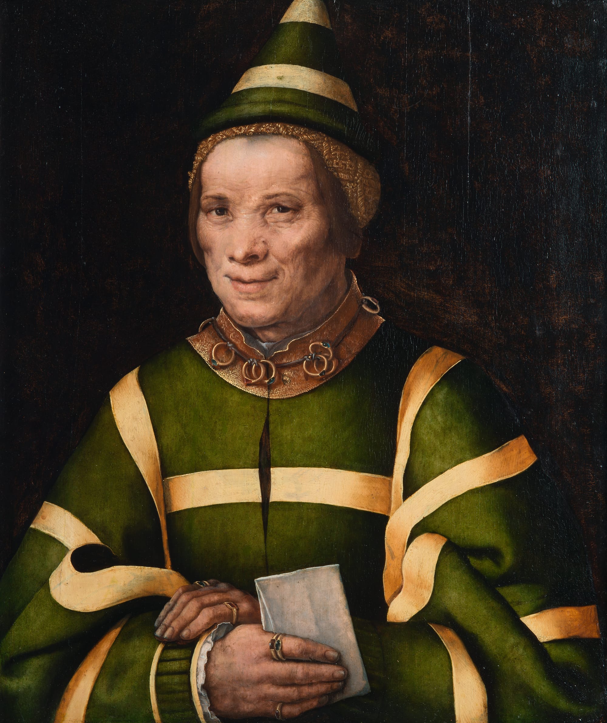 As a royal court figure, the fool offered comic relief by saying in jest to the monarch what civilians could not. The most fascinating portrait in the entire show is Jan Sanders van Hemessen's 1525 likeness of Elisabeth, the fool who entertained Queen Anne of Hungary (1503–1547) for many years. It is highly unusual to see a woman of advanced age donning the distinctive jester hat and robes, but it’s likely that Elisabeth’s wit and comic skill inspired the Queen to retain her position at court for so many years. We can’t know the exact circumstances of Elisabeth’s position because so many facets of her biography are lost to time. Likewise, the symbolism of the rings around her neck is unknown. Was the Queen so taken with her nonconformist fool that she commissioned a portrait? It is an image that raises more questions than it answers, but from a 21st-century perspective, it is a welcome revision to male-dominated histories of royal courts and jesters.