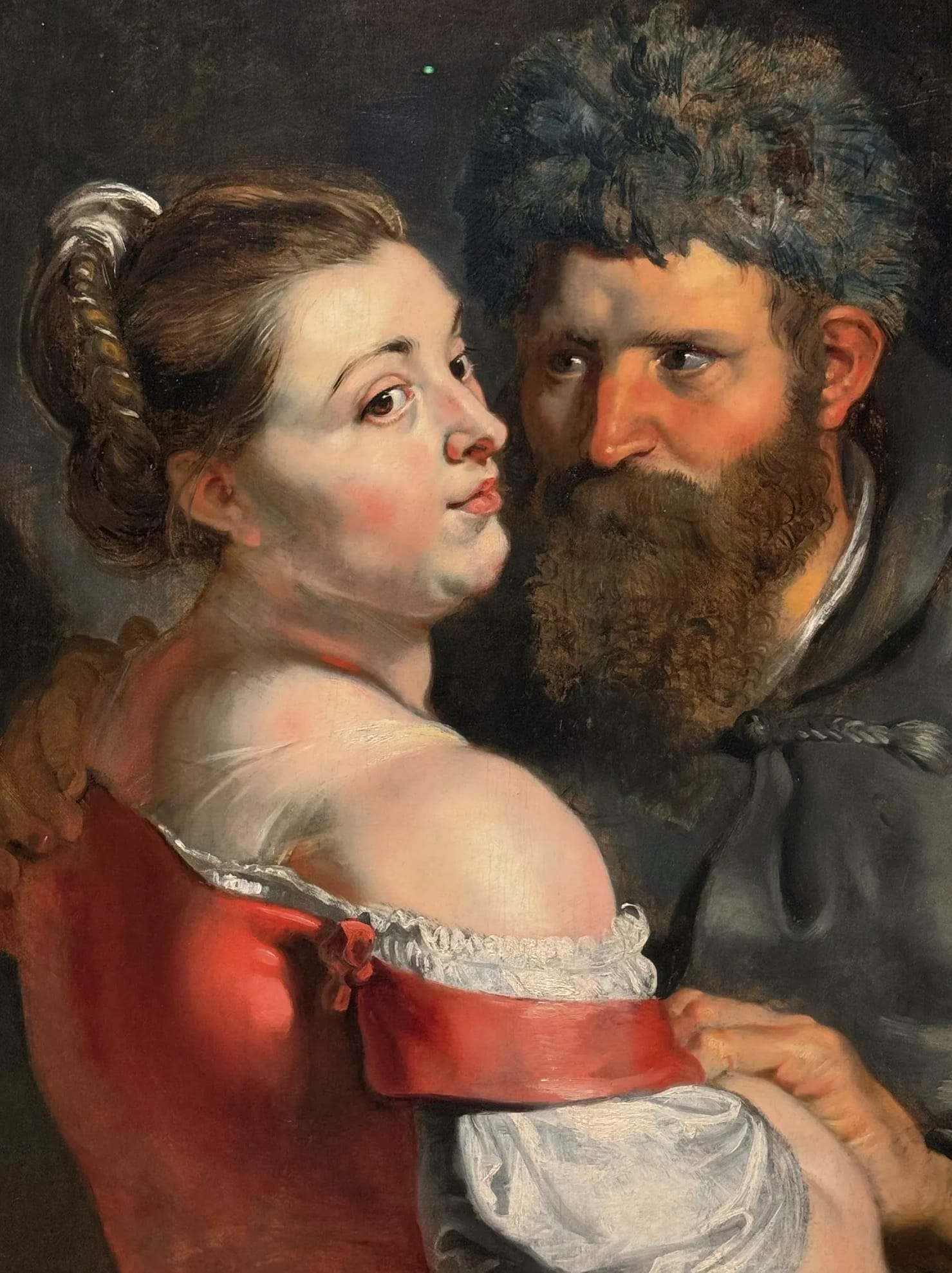 Jan Massys’s painting "Riddle: The World Feeds Many Fools" (1530) comes closest in the exhibition to visually defining the fool. Two young men in an embrace wear jester hats with tips that mimic donkey ears, playing on the (incorrect) myth that the animals are unintelligent. An unhooded figure’s full head of boyish hair accentuates his immaturity.