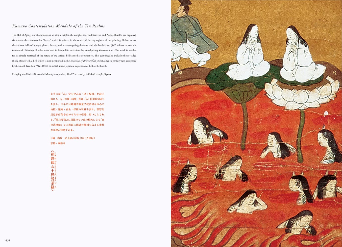 Hell in Japanese Art is a massive book, totaling 592 pages of illustrations and related texts by researchers Kajitani Ryoji and Nishida Naoki, printed in both English and Japanese. The volume features artworks created between the 12th and 19th centuries, and focuses largely on those designated as Japanese National Treasures or Important Cultural Properties, meaning that they possess exceptional historical or artistic value.