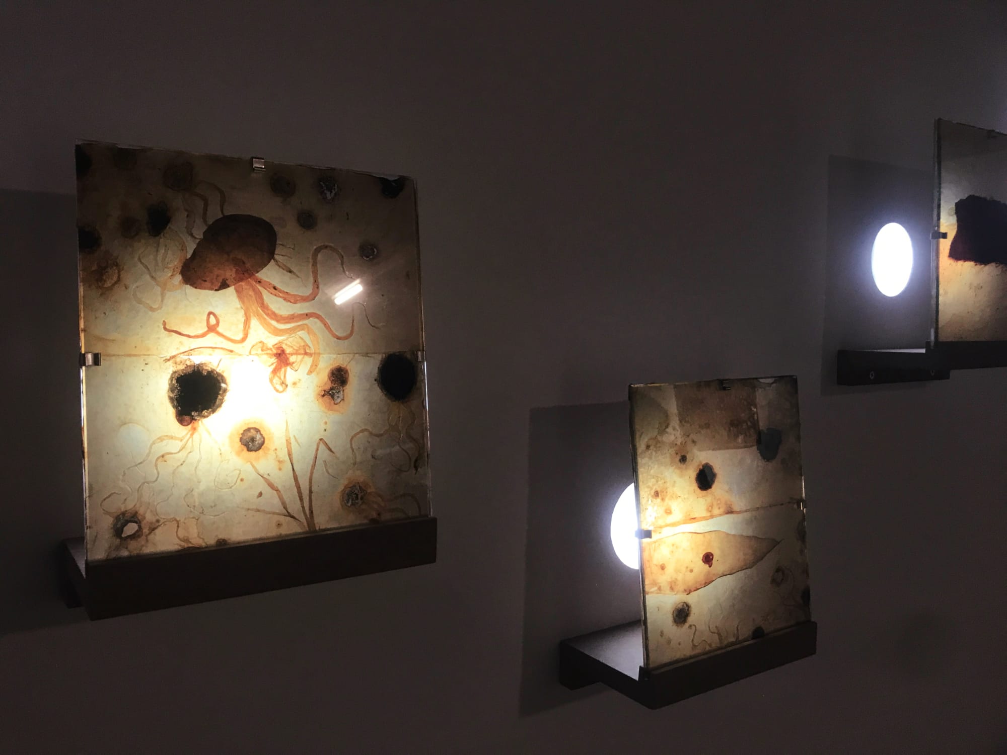 In addition to being more ecologically sustainable, organic materials also yield more unpredictable results, forcing the artist into a position of collaborating with nature rather than trying to fully control it, as in Ekin Kano’s blown-glass sculpture "The Body Living Itself" (2019), which continually evolves due to the bacteria and fungal flora growing inside its translucent vessel. Another work by Kano, "Worshiping Ancestors" (2019–24), preserves the microorganisms from cellulose waste under glass in a series of icon-like images, honoring the origin of all life, including our own.