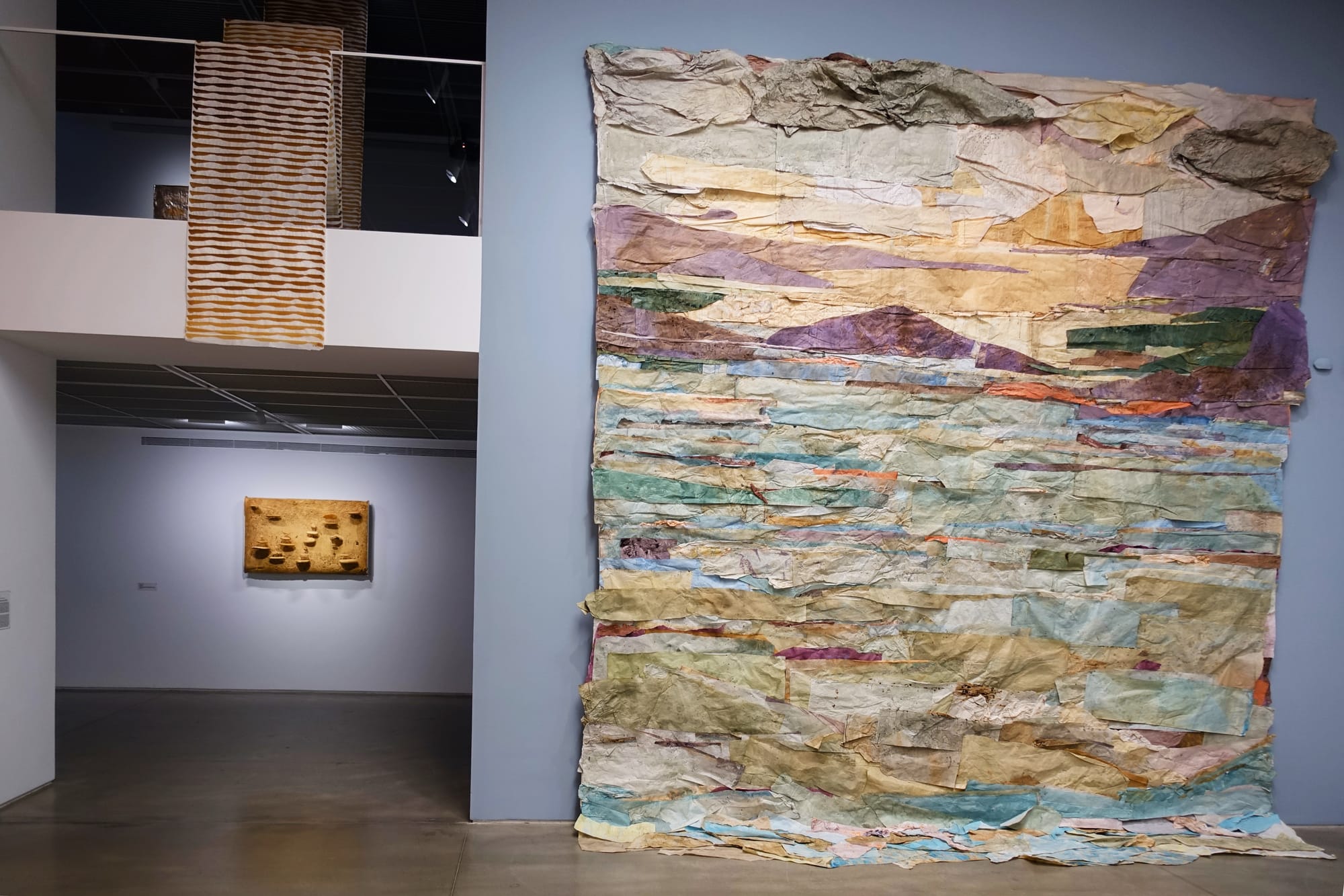 Many of the artists selected by curators Burcu Çimen and Didem Yazıcı utilize natural and recycled materials in their work, suggesting that global change must start at home (or in this case, the studio). Hanging in the central atrium of the exhibition, Berna Dolmacı’s large-scale seascape "Foggy Blue" (2022), for example, is collaged from scrap paper colored with coffee, tea, henna, hibiscus, and other natural pigments.