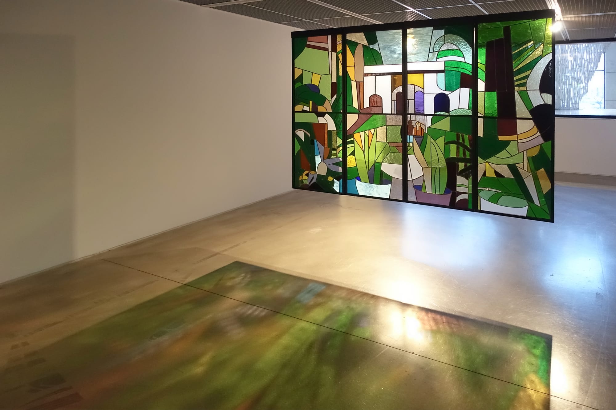 Where "Foggy Blue" is soft and dreamlike, the boldly backlit installation of Rozelin Akgün’s "Pine (Patch)" (2024), a quilt of biomaterial squares produced from milk thistle (a common weed) and food-based dyes, makes these modest materials gleam like stained glass. An accompanying explanation of Akgün’s working process and the importance of weeds alludes to the risks of losing traditional knowledge about plants without explicitly mentioning the various cultural and political pressures on the artist’s majority-Kurdish hometown of Diyarbakır, including construction in the historic Hevsel Gardens, where she gathered her thistle plants.