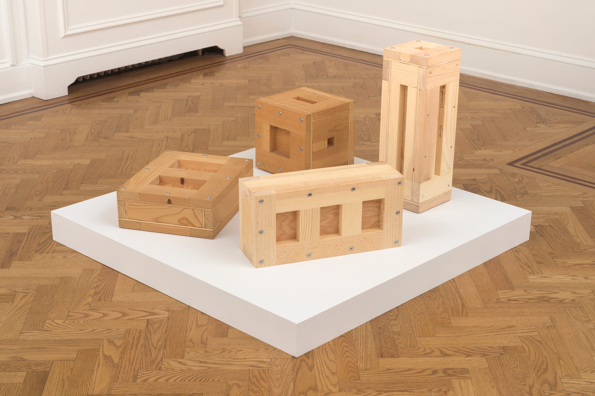 Installation view of "Untitled (1000 cubic inches)" (1996), all components wood with metal hardware and editions of 40, in Richard Artschwager: Boxed In at David Nolan Gallery, New York