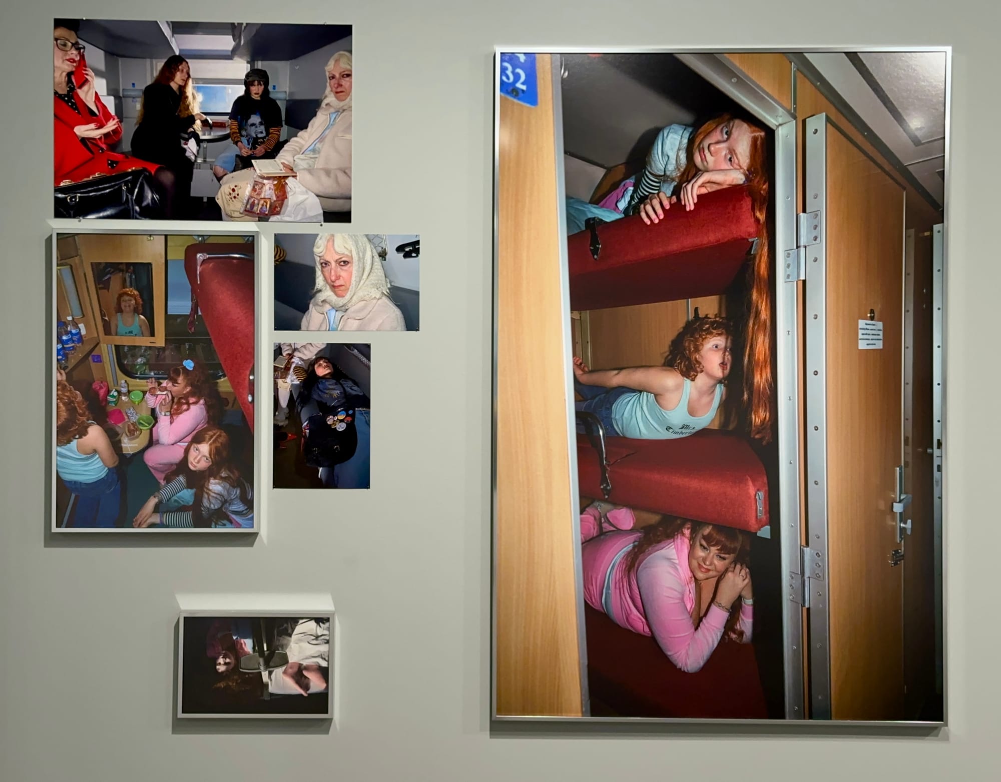 Elsewhere, Ukrainian artist Julie Poly’s 2025 photographs explore the life of Ukrzaliznytsia, the highly efficient and hospitable national rail system that gives the series its name. She capture scenes of everyday life: a female soldier in fatigues curled up and asleep in a sleeper car next to her black dog, a smiling woman with several fluffy dogs and numerous trophies; a shirtless, tattooed soldier with his head bowed as if deep in thought or prayer; children with their toys, a train car transformed into a makeshift hospital, diligent conductors at work. There is such humanity in these images — joy, love, sorrow, endurance, tenderness — that contrasts so extremely with Russia’s inhumane war. A young woman lying on her back calmly gazes at the camera. She embodies the whole nation’s exhaustion and resolve.